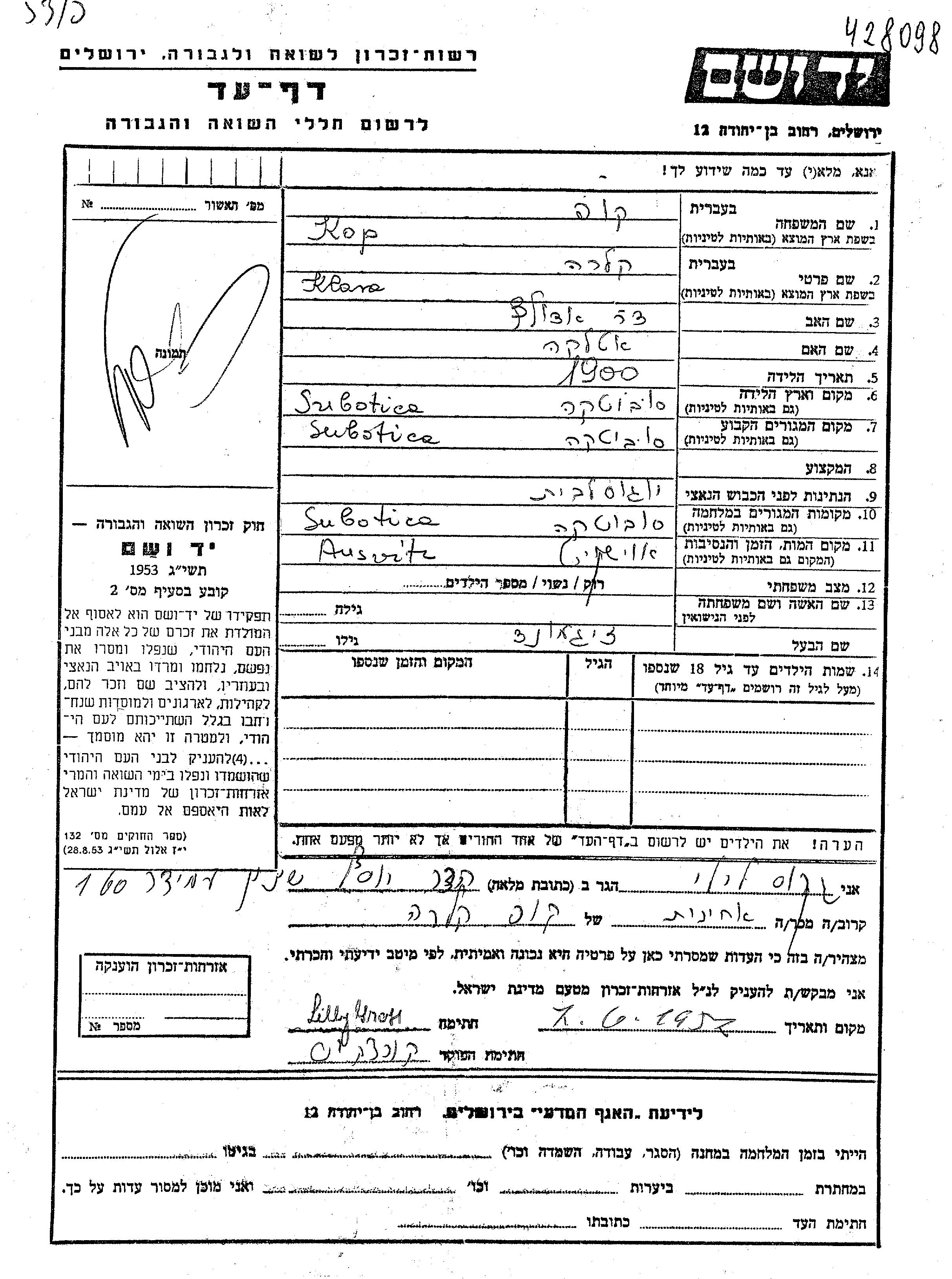 Klara Kop wurde im Jahr 1900 in Subotica, Jugoslawien geboren. Sie war die Tochter von Adolf und Etelka. Sie war mit Zigmund Verheiratet. Vor dem Zweiten Weltkrieg lebte sie in Subotica, Jugoslawien. Während des Krieges war sie in Subotica, Jugoslawien.