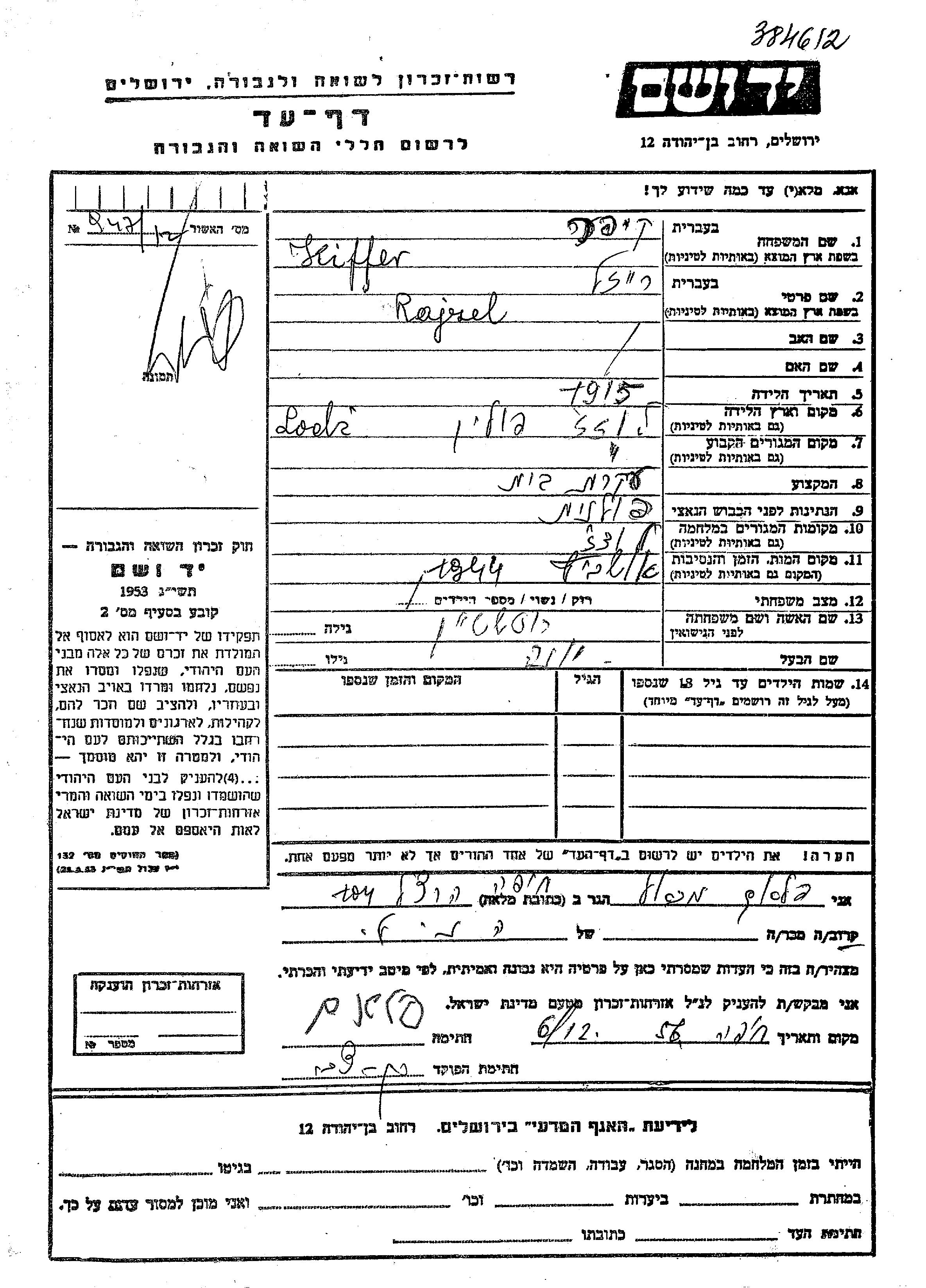 Rajzel Kiffer Kiper, geb. Rotshtein wurde im Jahr 1915 in Lodz, Polen geboren. Sie war Hausfrau und mit Yona Verheiratet. Vor dem Zweiten Weltkrieg lebte sie in Lodz, Polen. Während des Krieges war sie in Lodz, Polen.