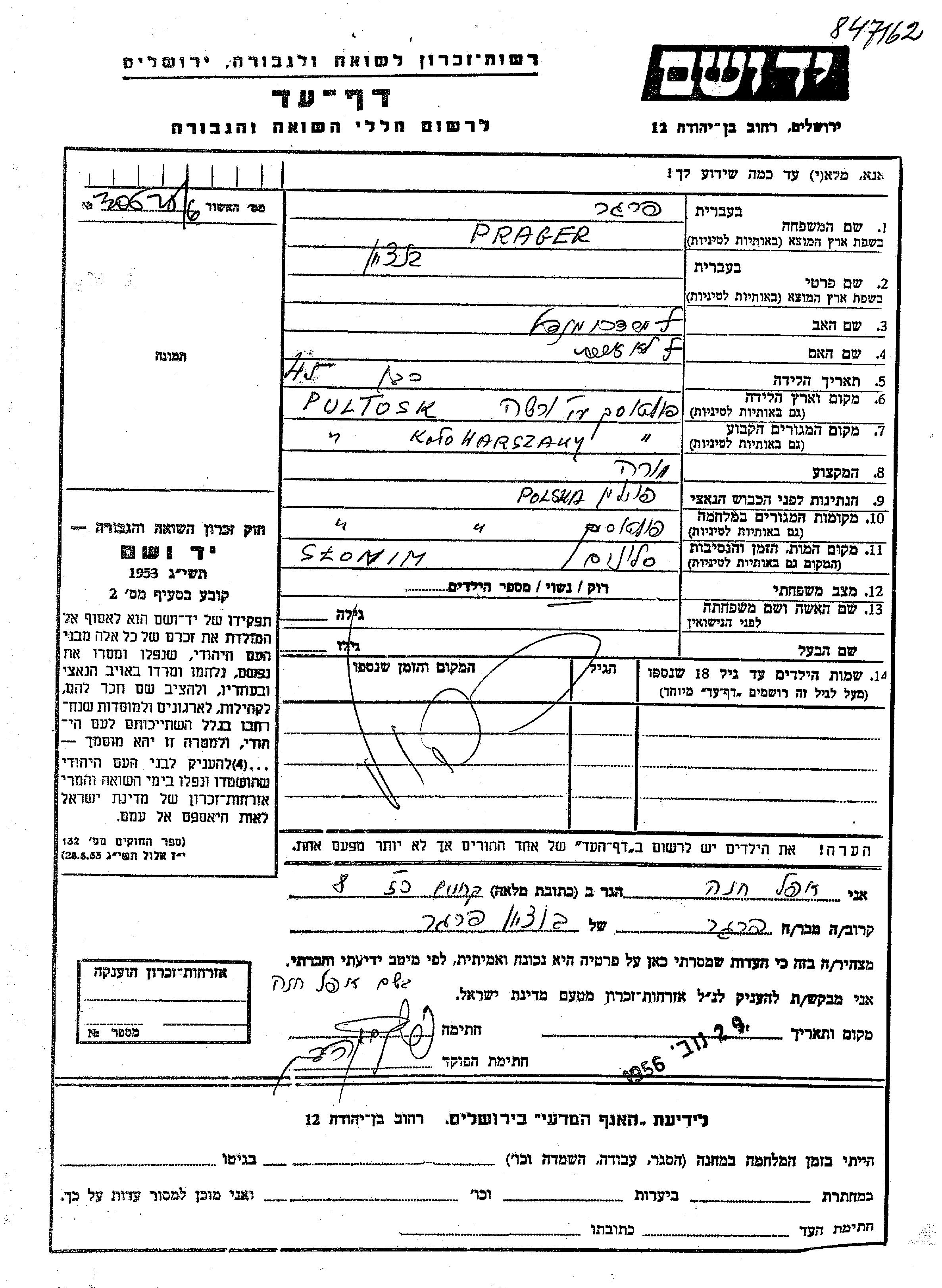 Bentzion Prager wurde in Pultusk, Polen geboren. Er war der Sohn von Mordekhai Mendel. Er war Lehrer/in und Verheiratet. Vor dem Zweiten Weltkrieg lebte er in Pultusk, Polen. Während des Krieges war er in Pultusk, Polen.