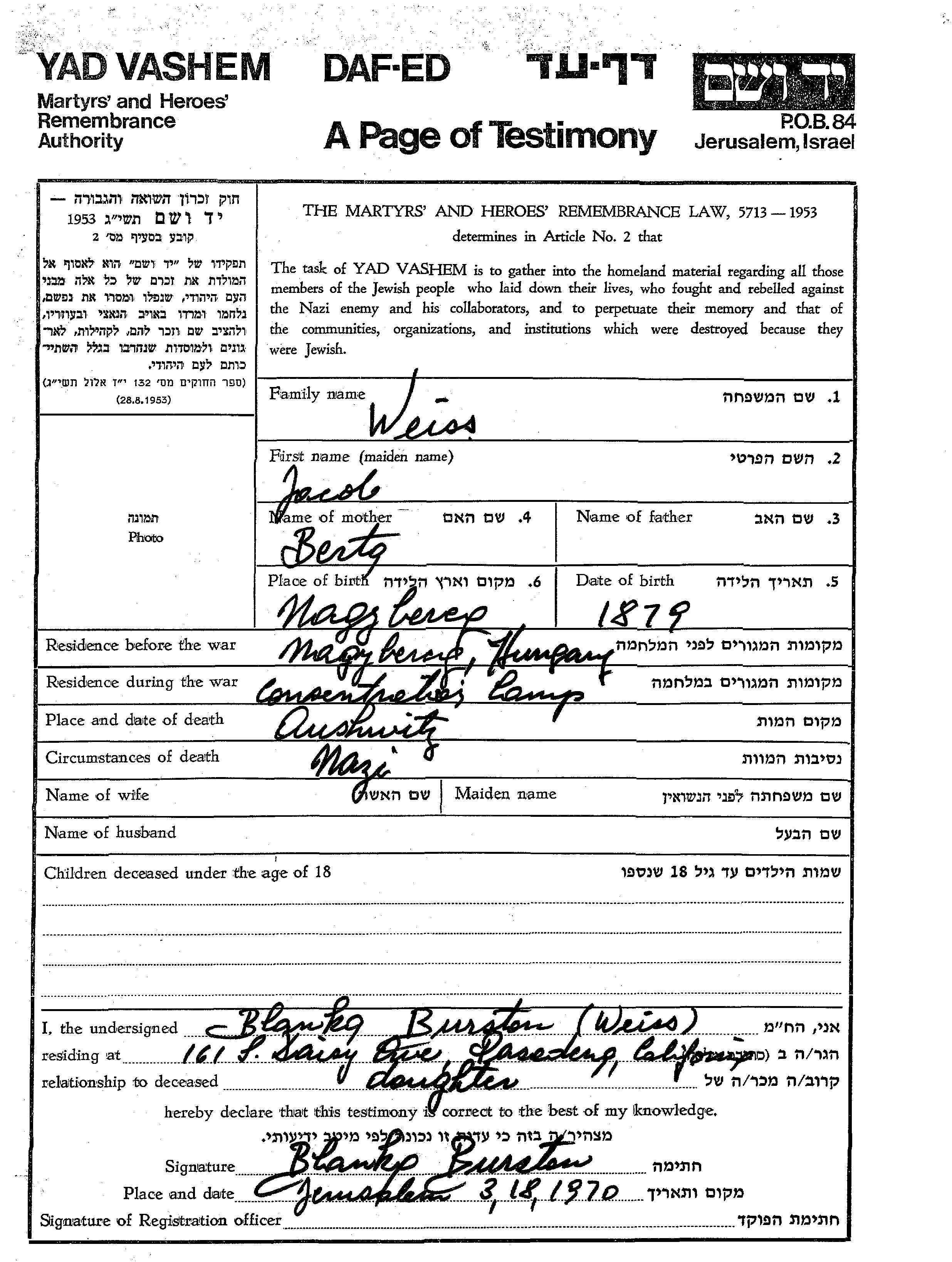 Yacob Weiss wurde im Jahr 1879 in Nagybereg, Tschechoslowakei geboren. Er war der Sohn von Berta. Vor dem Zweiten Weltkrieg lebte er in Nagybereg, Tschechoslowakei.