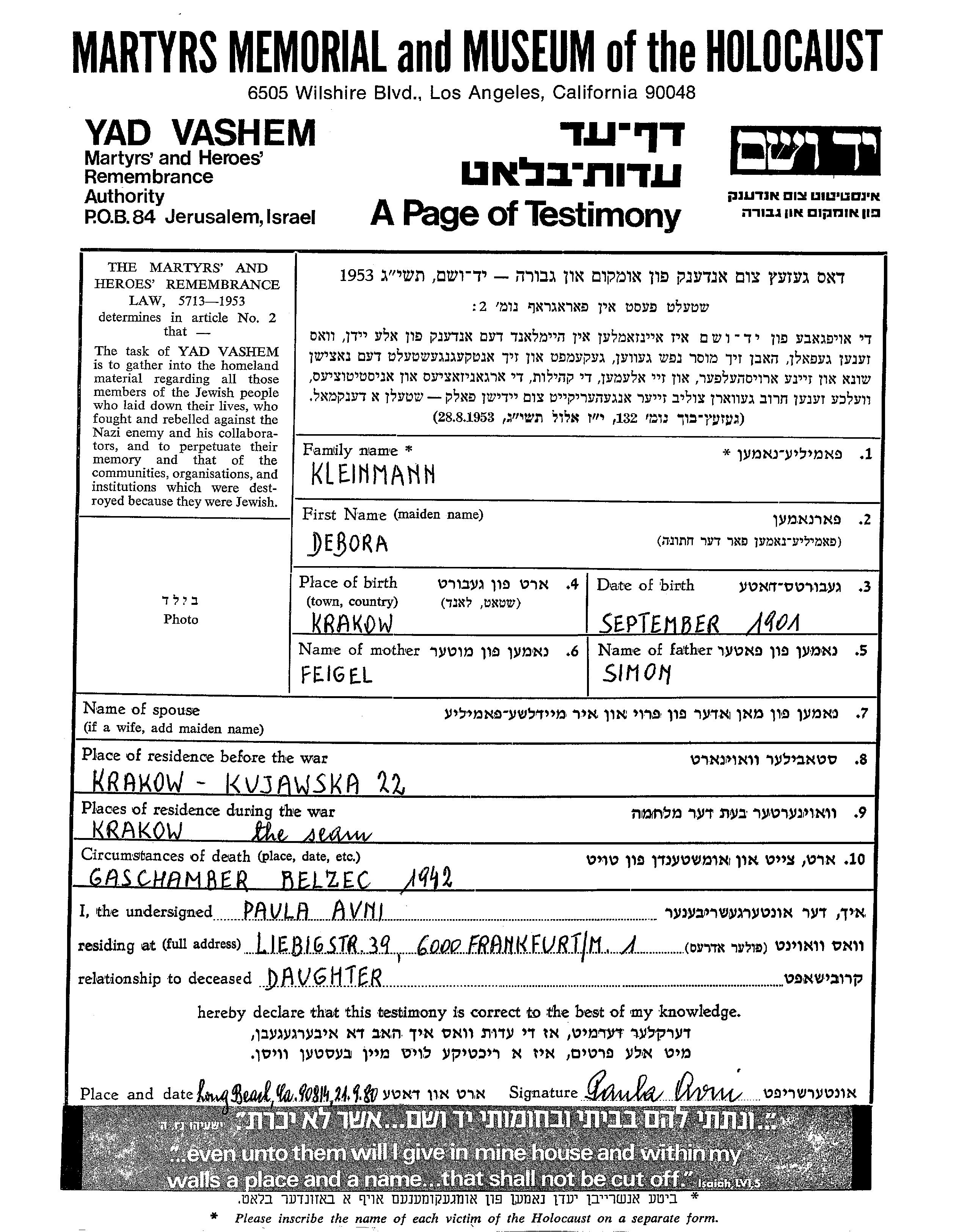 Kleinmann Debora 1901 Krakow, Polen Gedenkblatt
