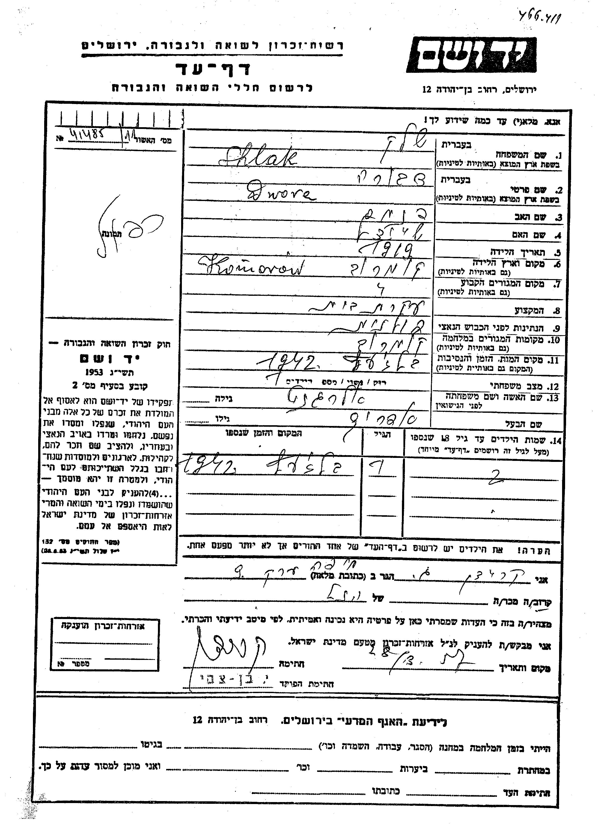 Dwora Shlak, geb. Alergant wurde im Jahr 1919 in Komorow, Polen geboren. Sie war die Tochter von Pinkhas und Sheindl. Sie war Hausfrau und mit Efraim Verheiratet. Vor dem Zweiten Weltkrieg lebte sie in Komorow, Polen. Während des Krieges war sie in Komorow, Polen.