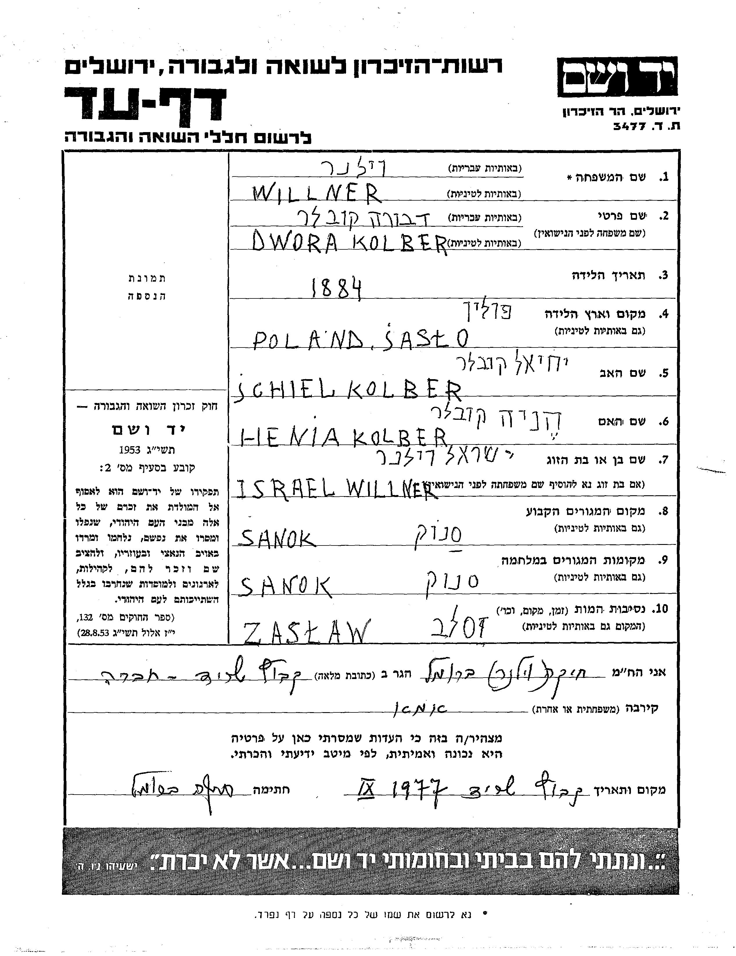 Dwora Willner, geb. Kolber wurde im Jahr 1884 in Jaslo, Polen geboren. Sie war die Tochter von Jchiel und Henia. Sie war mit Israel Verheiratet. Vor dem Zweiten Weltkrieg lebte sie in Sanok, Polen. Während des Krieges war sie in Sanok, Polen.