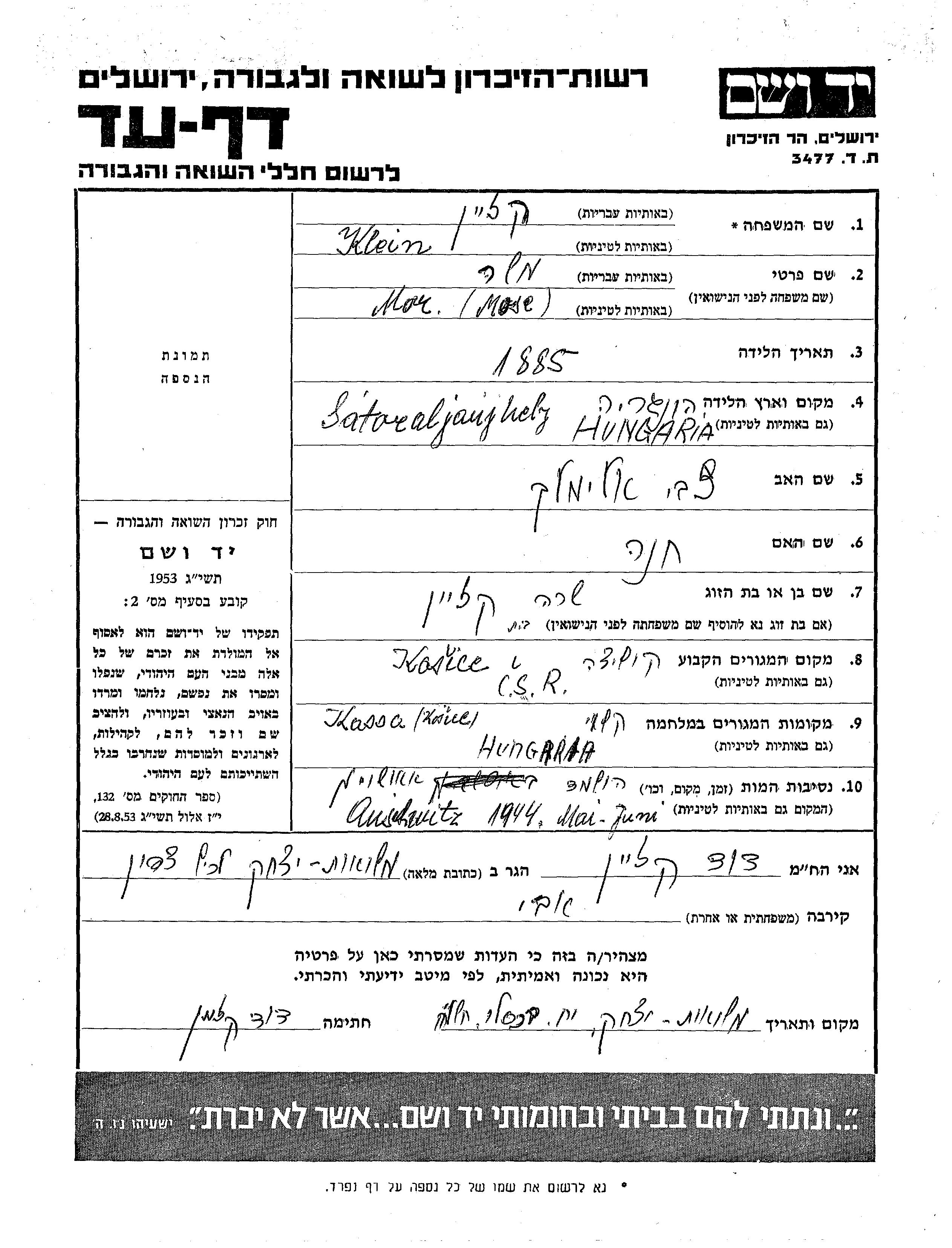 Mor Mose Klein wurde im Jahr 1885 in Satoraljaujhely, Ungarn geboren. Er war der Sohn von Tzvi Elimelekh und Khana. Er war mit Sara Verheiratet. Vor dem Zweiten Weltkrieg lebte er in Kosice, Tschechoslowakei. Während des Krieges war er in Kosice, Tschechoslowakei.