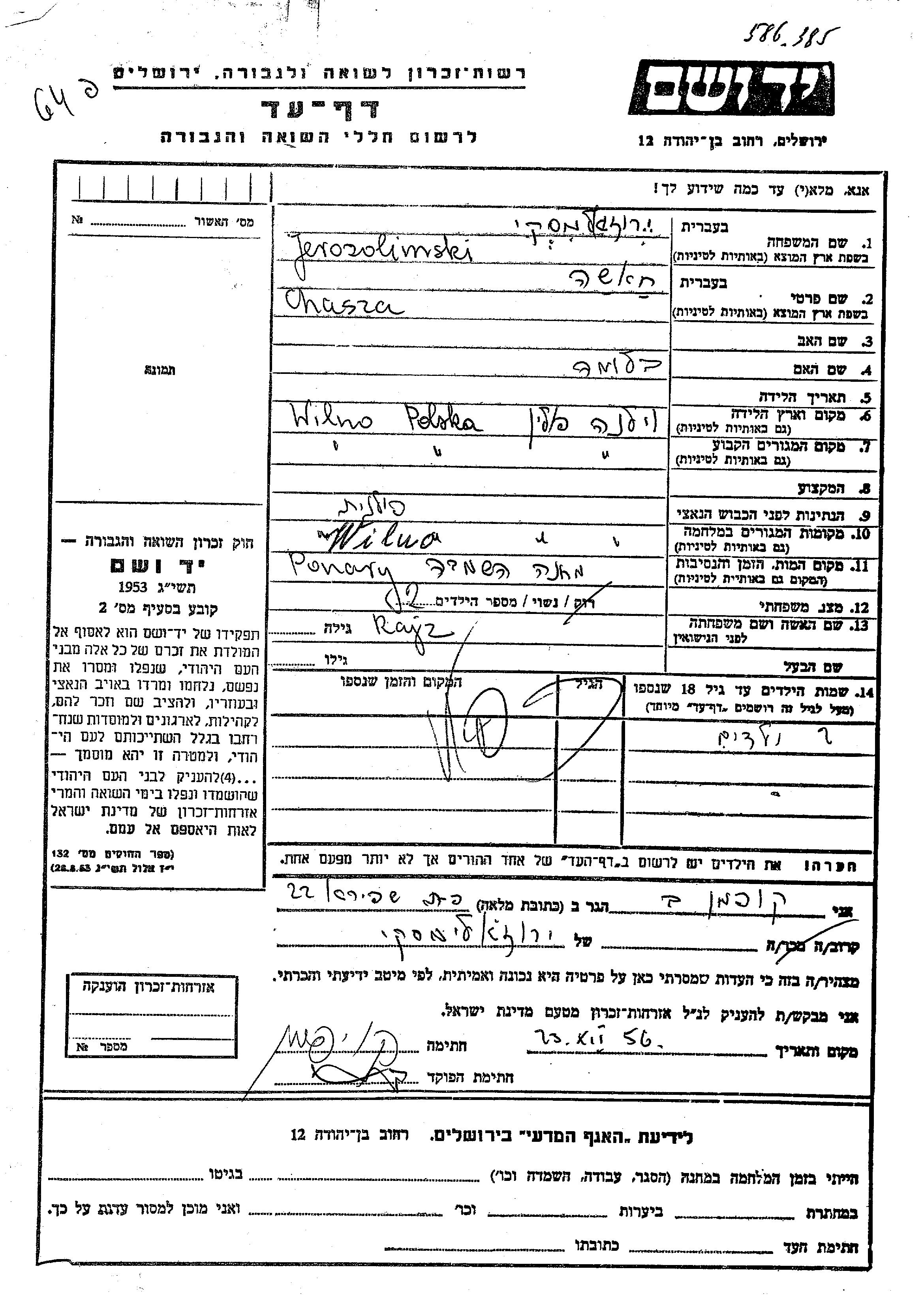 Chasza Jerozolimski, geb. Rajz wurde in Wilno, Polen geboren. Sie war die Tochter von Bluma. Sie war Verheiratet. Vor dem Zweiten Weltkrieg lebte sie in Wilno, Polen. Während des Krieges war sie in Wilno, Polen.