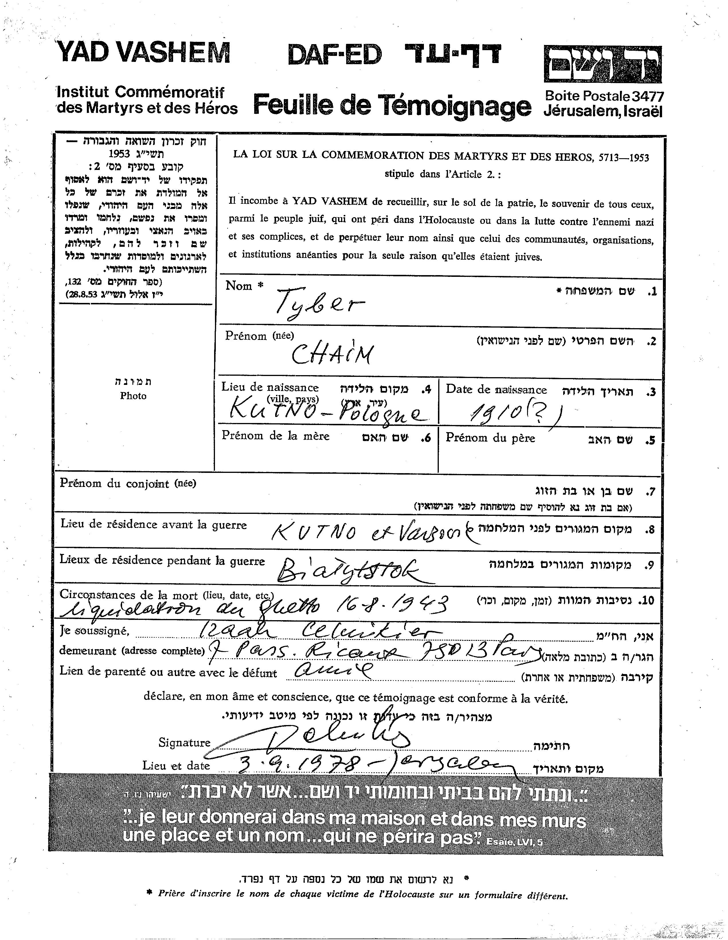 Chaim Tyber wurde im Jahr 1910 in Kutno, Polen geboren. Vor dem Zweiten Weltkrieg lebte er in Kutno, Polen. Während des Krieges war er in Bialystok, Polen.