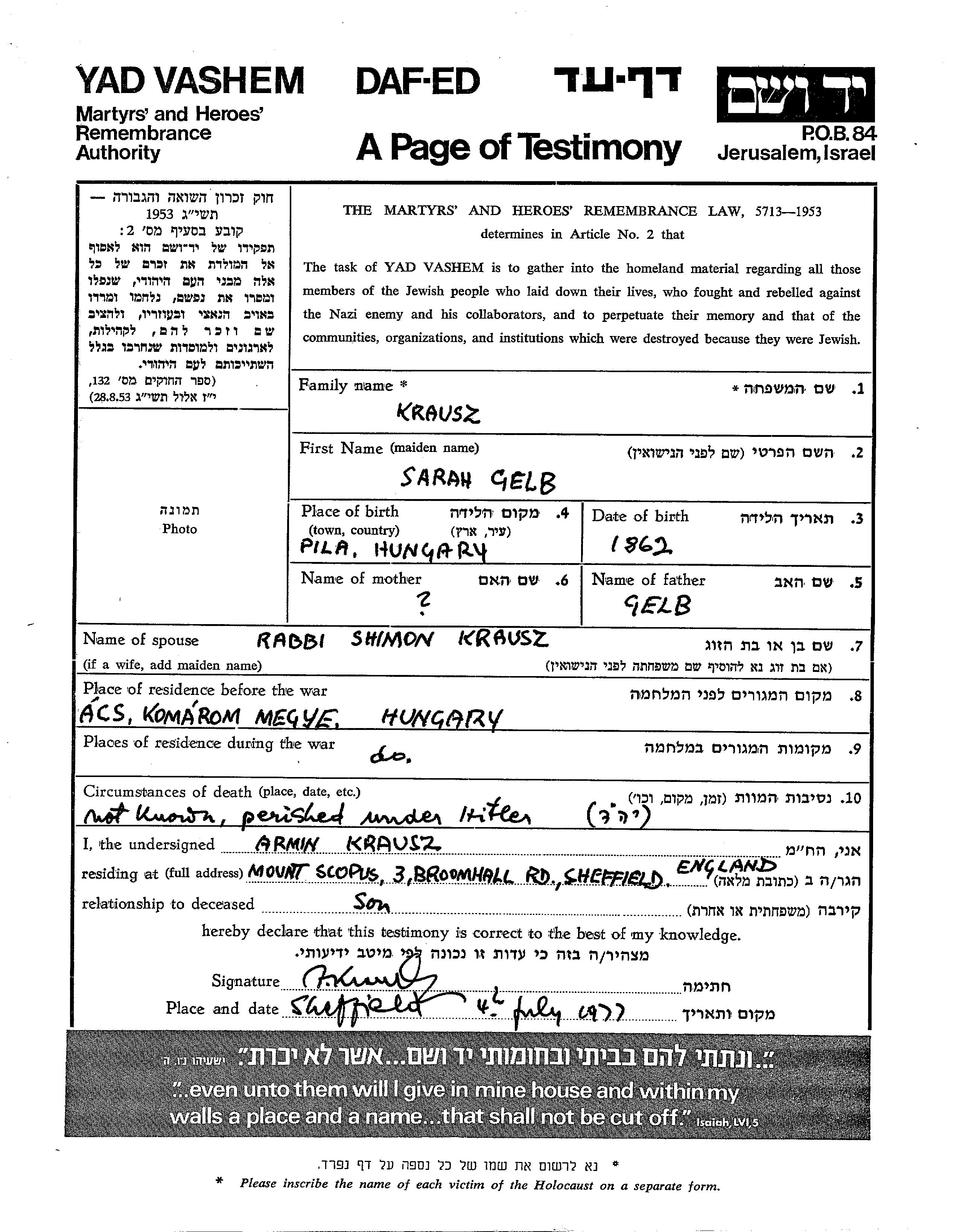Sarah Krausz, geb. Gelb wurde im Jahr 1862 in Undeciphered Place, Ungarn geboren. Sie war mit Shimon Verheiratet. Vor dem Zweiten Weltkrieg lebte sie in Acs, Ungarn.