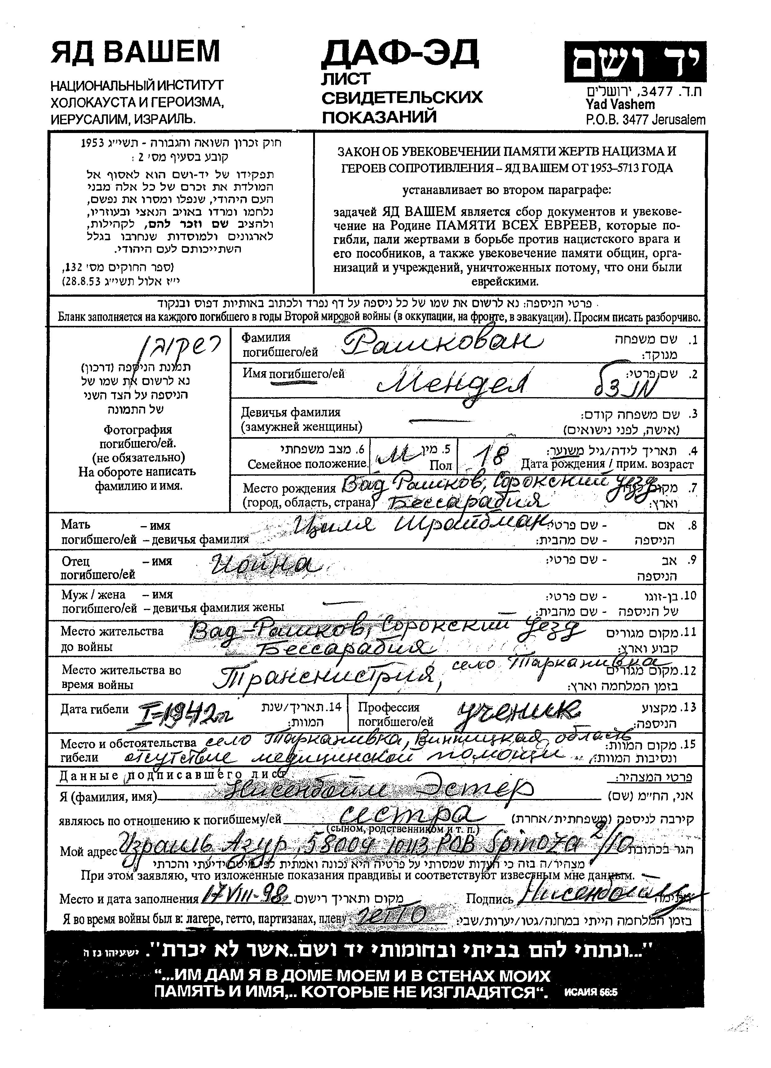 Mendel Rashkovan wurde in Vad Rashkov, Rumänien geboren. Er war der Sohn von Ioyna und Tzilya. Er war Student. Vor dem Zweiten Weltkrieg lebte er in Vad Rashkov, Rumänien. Während des Krieges war er in Transnistria, Ukraine (UdSSR).