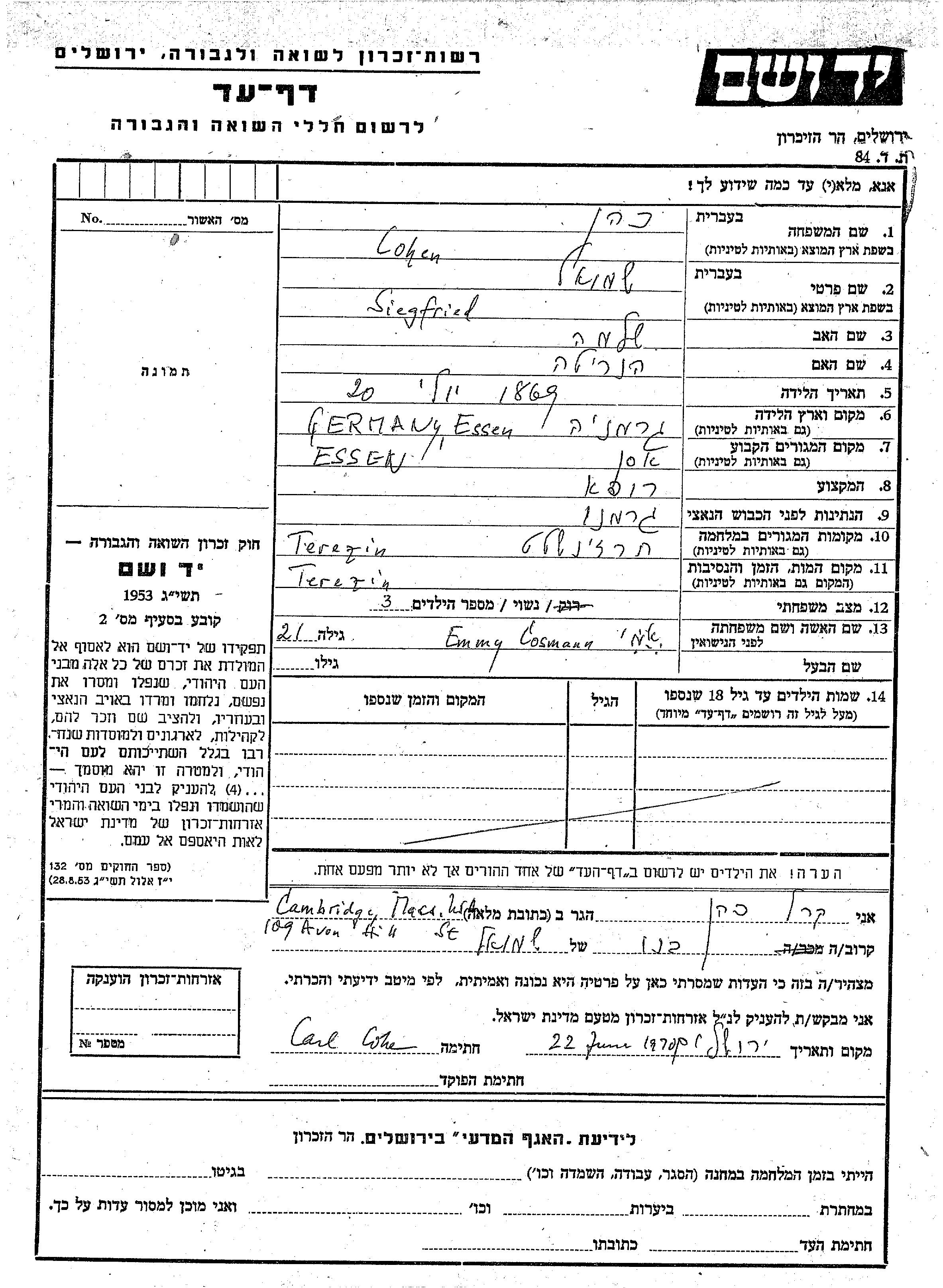 Siegfried Shmuel Cohen wurde im Jahr 1869 in Deutsches Reich geboren. Er war der Sohn von Shlomo und Henrieta. Er war Arzt/ärztin und mit Emmy Emi, geb. Cosmann Verheiratet. Vor dem Zweiten Weltkrieg lebte er in Essen, Deutsches Reich. Während des Krieges war er in Terezin, Tschechoslowakei.