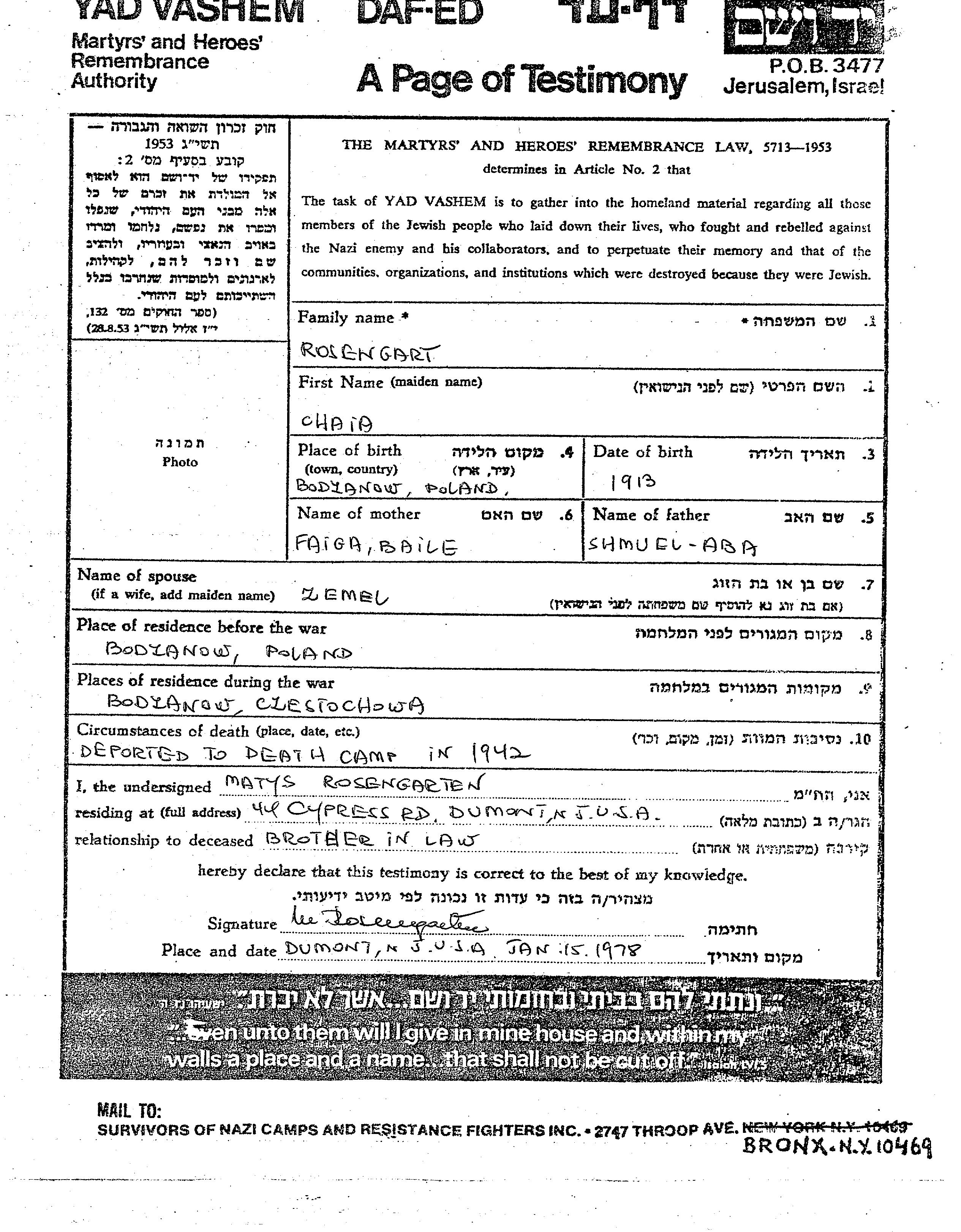 Chaia Rosengart wurde im Jahr 1913 in Bodzanow, Polen geboren. Sie war die Tochter von Shmuel Aba und Faiga Baile. Sie war mit Zemel Verheiratet. Vor dem Zweiten Weltkrieg lebte sie in Bodzanov, Polen. Während des Krieges war sie in Czestochowa, Polen.