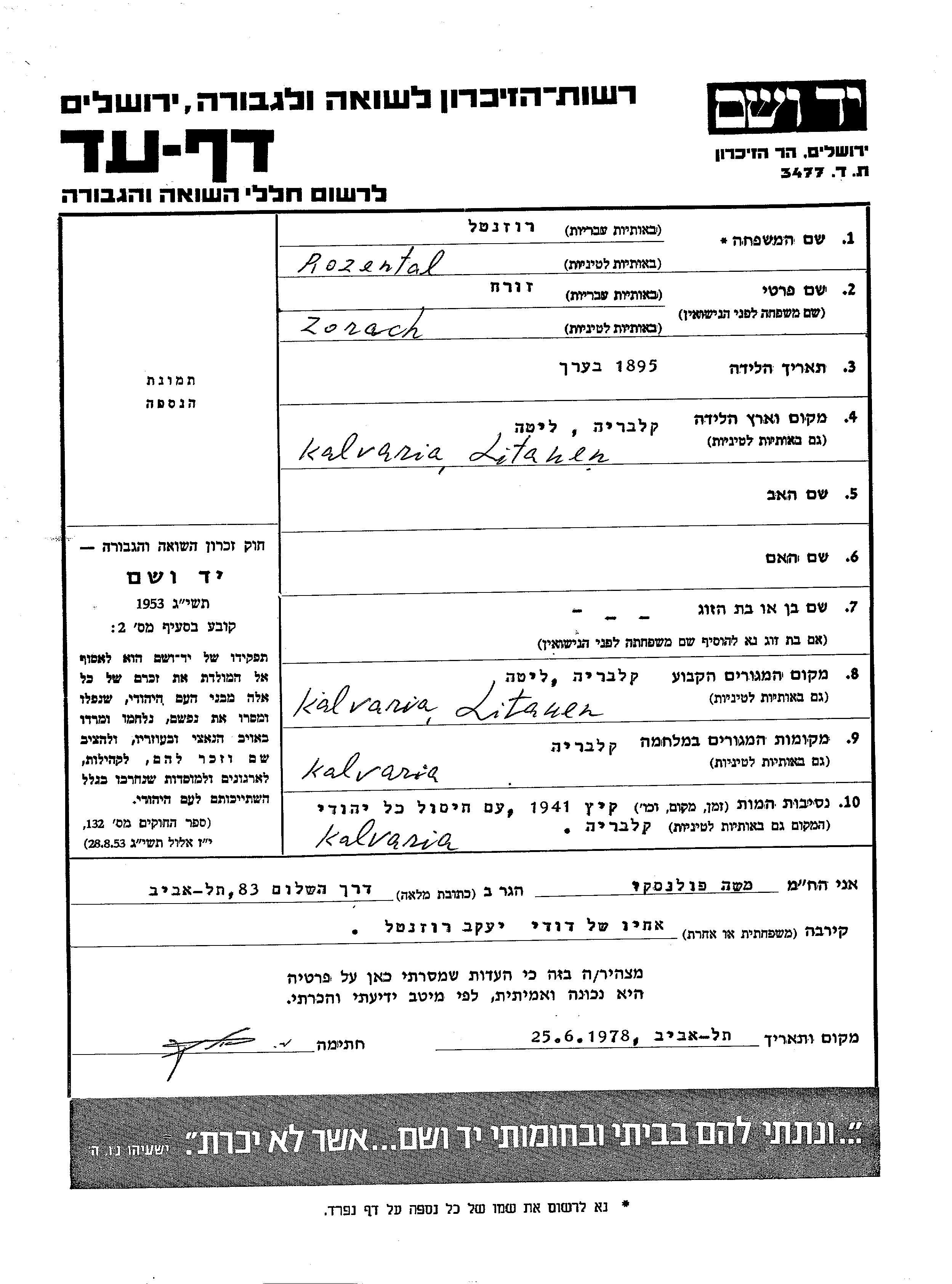 Zorach wurde in der Schoah ermordet. Todesort: Kalvaria, Litauen im Jahr 07/1941.