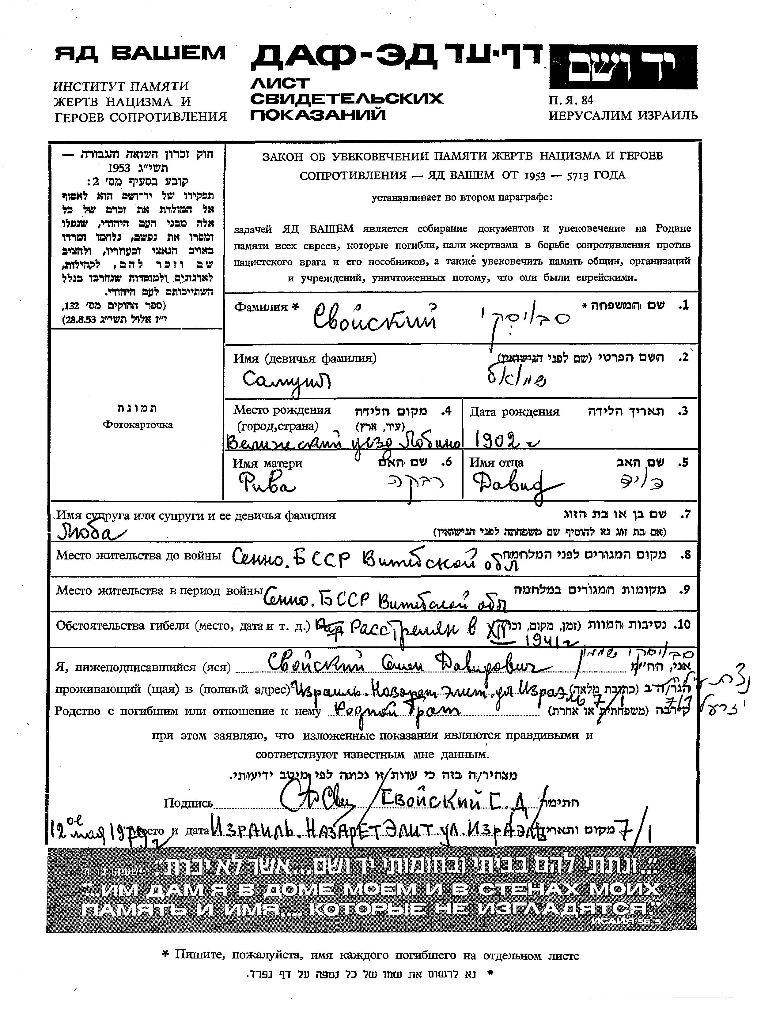Samuil wurde in der Schoah ermordet. Todesort: Senno, Weißrussland (UdSSR) im Jahr 09/1941.