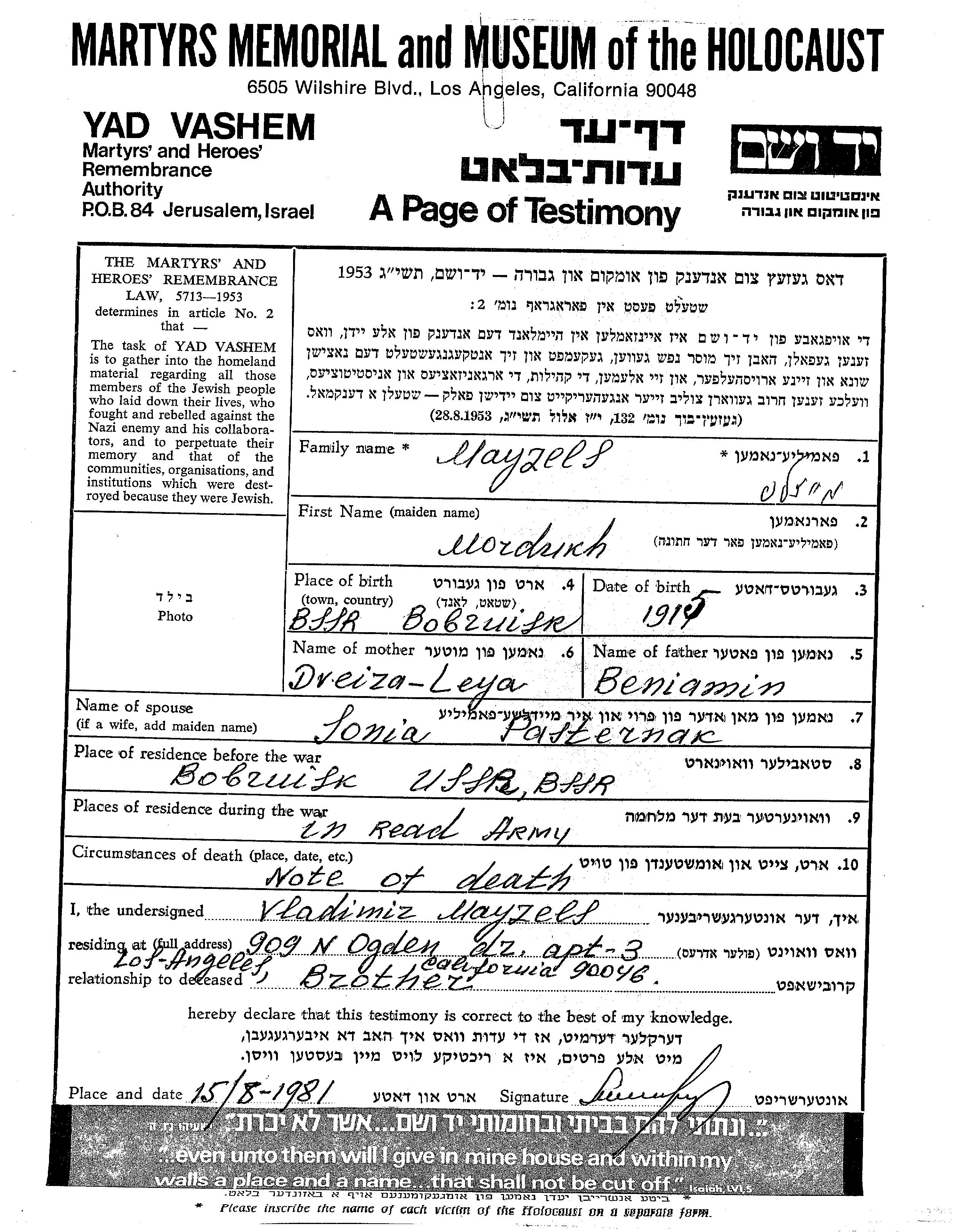 Mordukh Mayzels wurde im Jahr 1915 in Bobruysk, Weißrussland (UdSSR) geboren. Er war der Sohn von Beniamin und Dreiza Leya. Er war mit Sonia, geb. Pasternak Verheiratet. Vor dem Zweiten Weltkrieg lebte er in Bobruysk, Weißrussland (UdSSR). Während des Krieges war er in die Sowjetischen Streitkräfte.