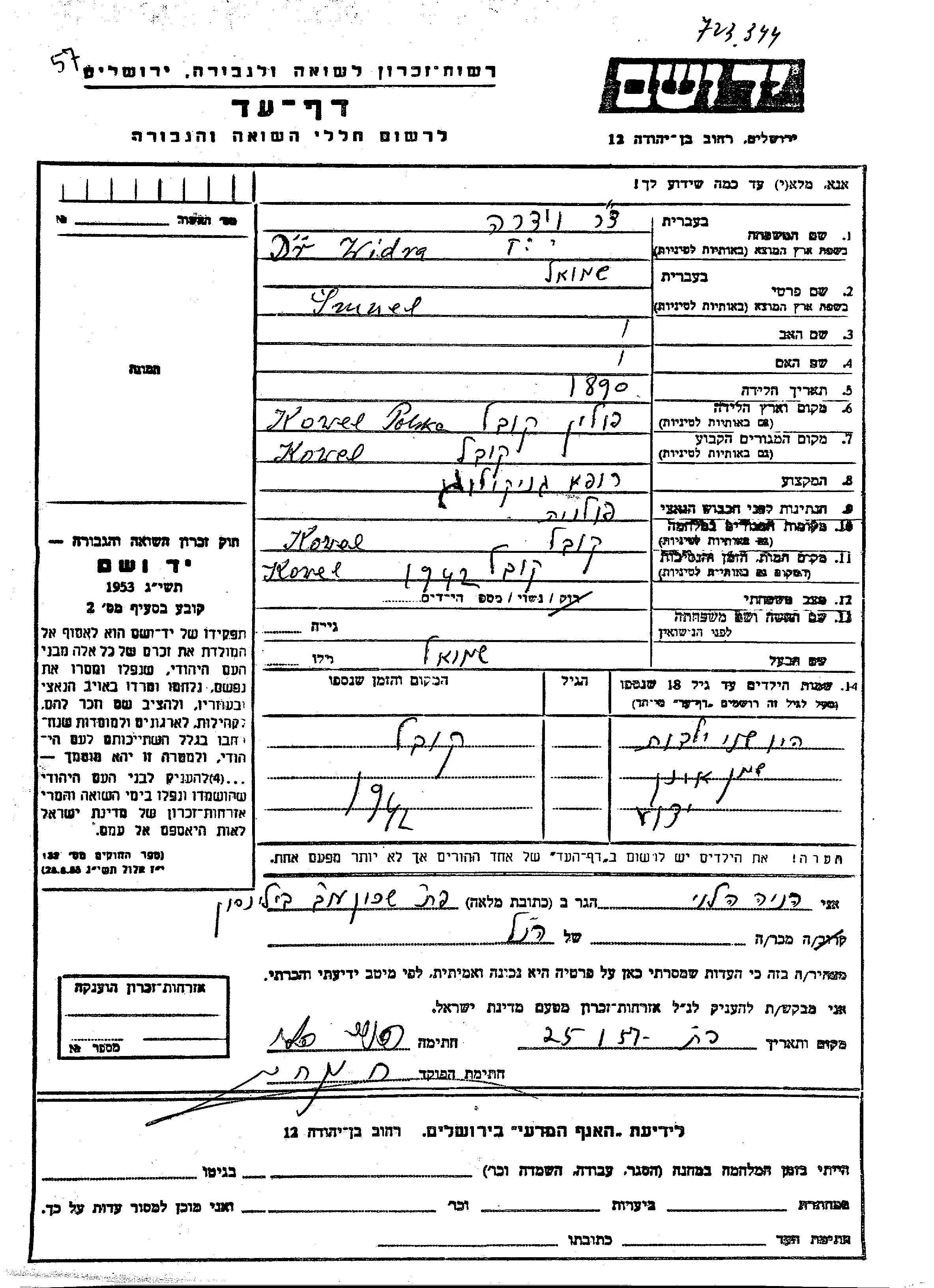 Dr. Widra wurde in der Schoah ermordet. Todesort: Kowel, Polen im Jahr 1942.