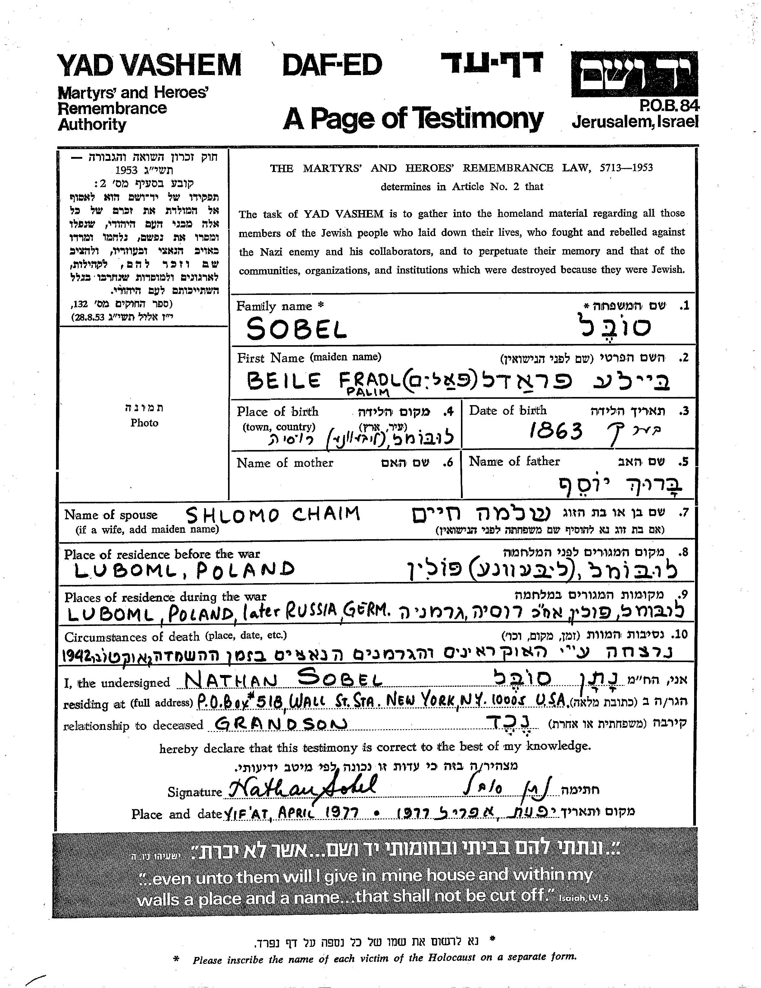 Beile Fradl Fradel Sobel, geb. Palim wurde im Jahr 1863 in Luboml, Polen geboren. Sie war die Tochter von Barukh Yosef. Sie war mit Chaim Shlomo Verheiratet. Vor dem Zweiten Weltkrieg lebte sie in Luboml, Polen. Während des Krieges war sie in Luboml, Polen.
