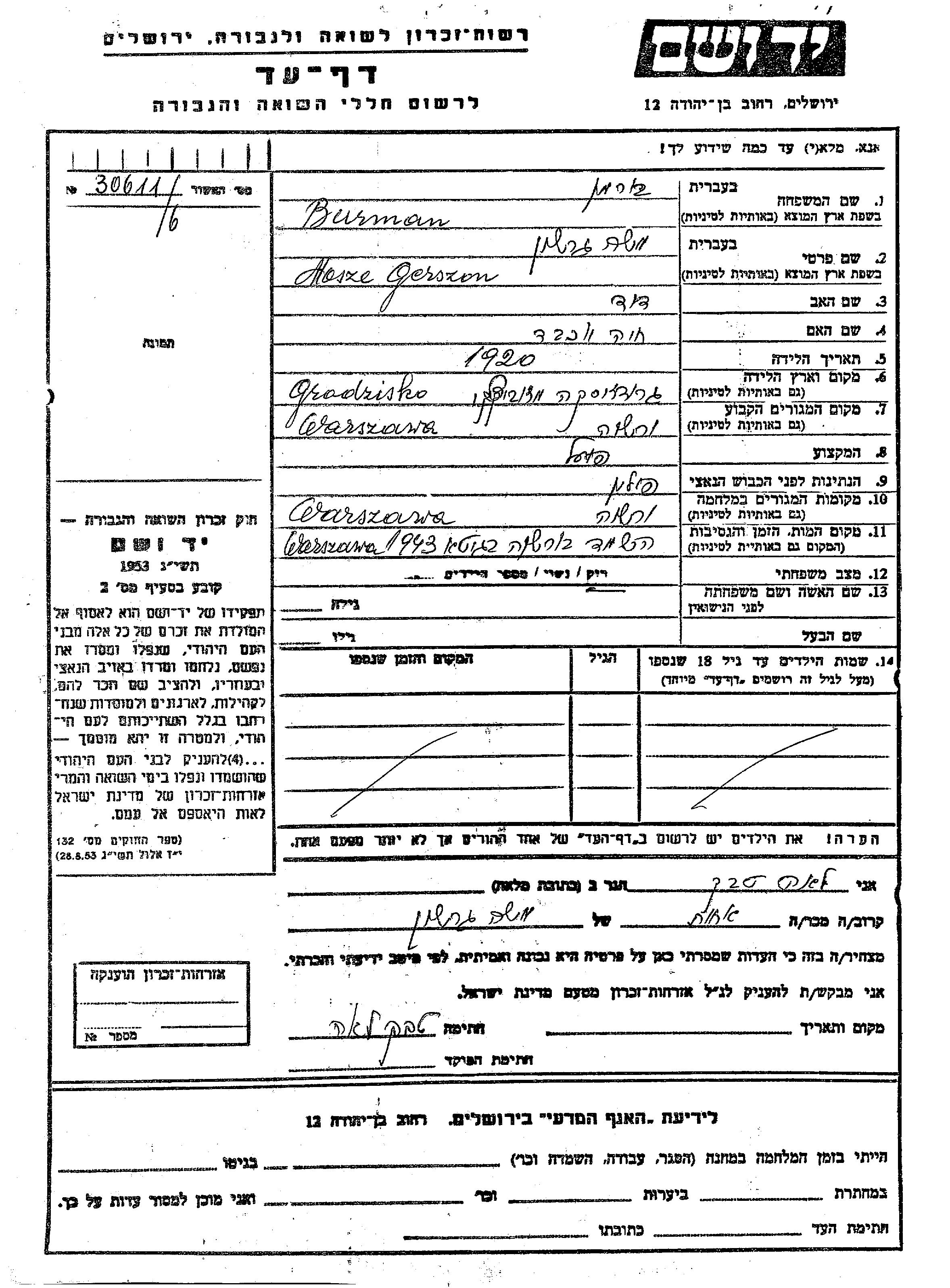 Mosze Gerszon Burman wurde im Jahr 1920 in Grodzisk Mazowiecki, Polen geboren. Er war der Sohn von David und Khava Yokheved. Er war Arbeiter/-in und Ledig. Vor dem Zweiten Weltkrieg lebte er in Warsaw, Polen. Während des Krieges war er in Warsaw, Polen.
