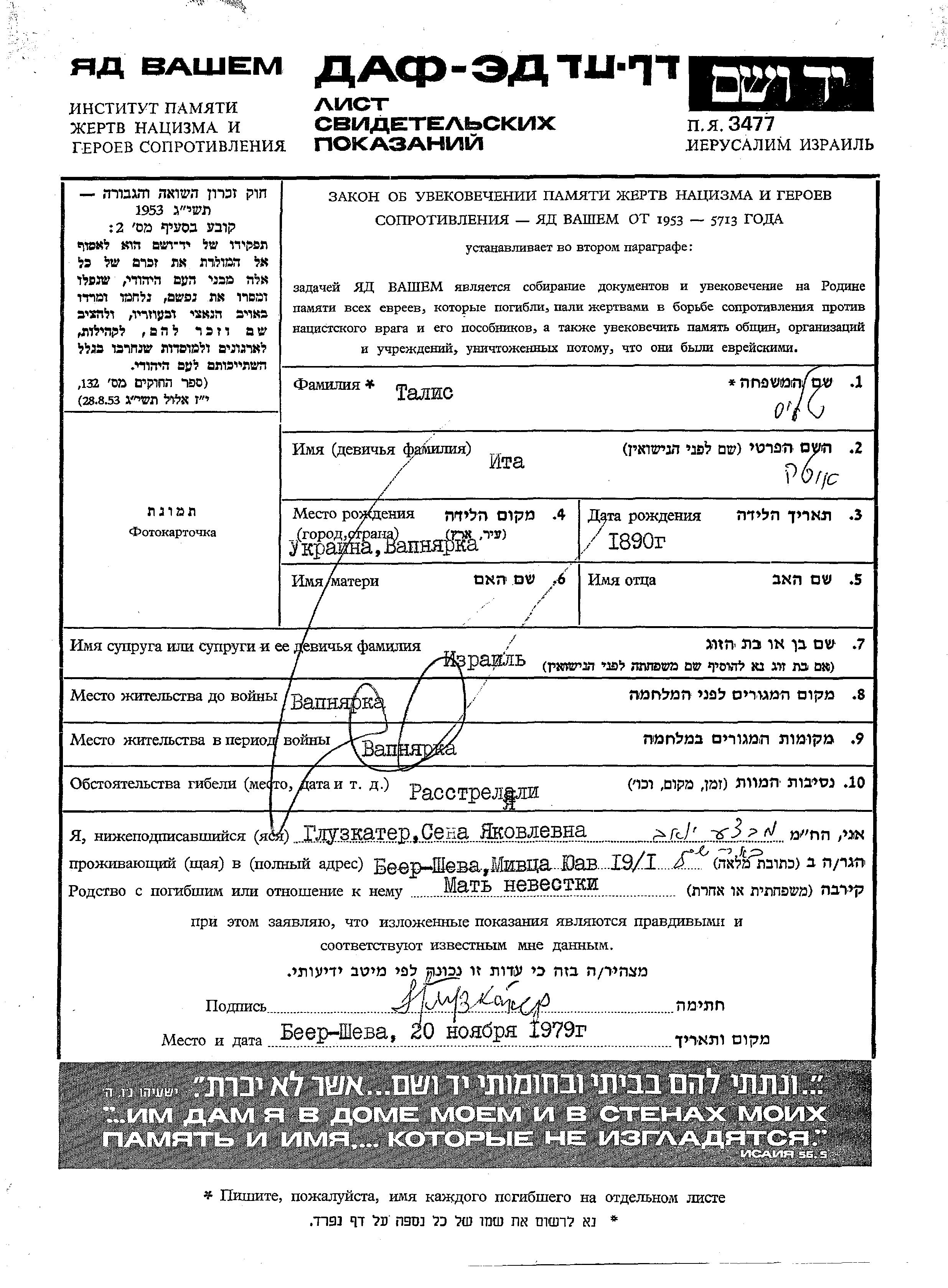 Ita Talis wurde im Jahr 1890 in Vapniarca, Ukraine (UdSSR) geboren. Sie war mit Izrail Verheiratet. Vor dem Zweiten Weltkrieg lebte sie in Vapniarca, Ukraine (UdSSR). Während des Krieges war sie in Vapniarca, Ukraine (UdSSR).