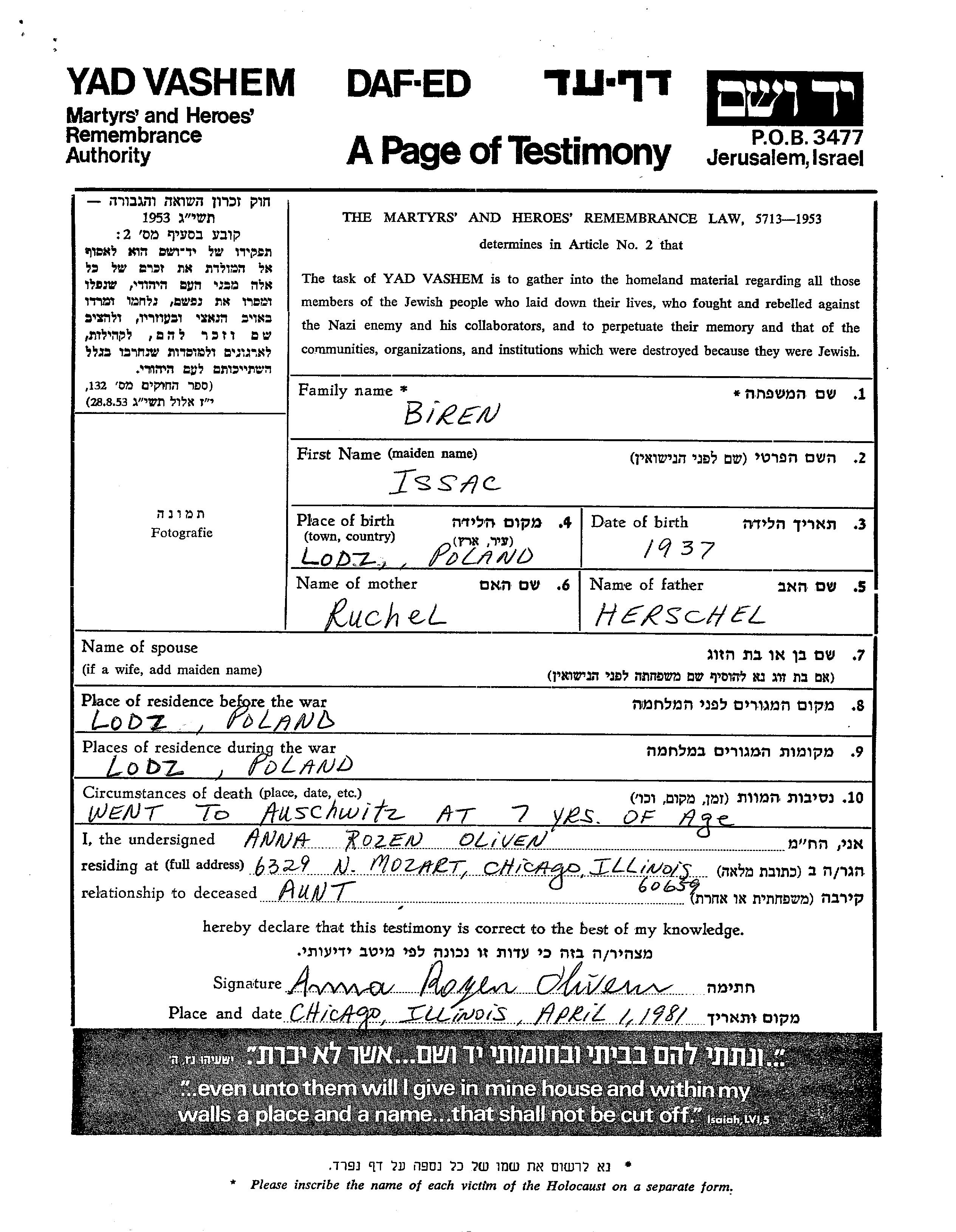 Issac Biren wurde im Jahr 1937 in Lodz, Polen geboren. Er war der Sohn von Herschel und Ruchel. Vor dem Zweiten Weltkrieg lebte er in Lodz, Polen. Während des Krieges war er in Lodz, Polen.