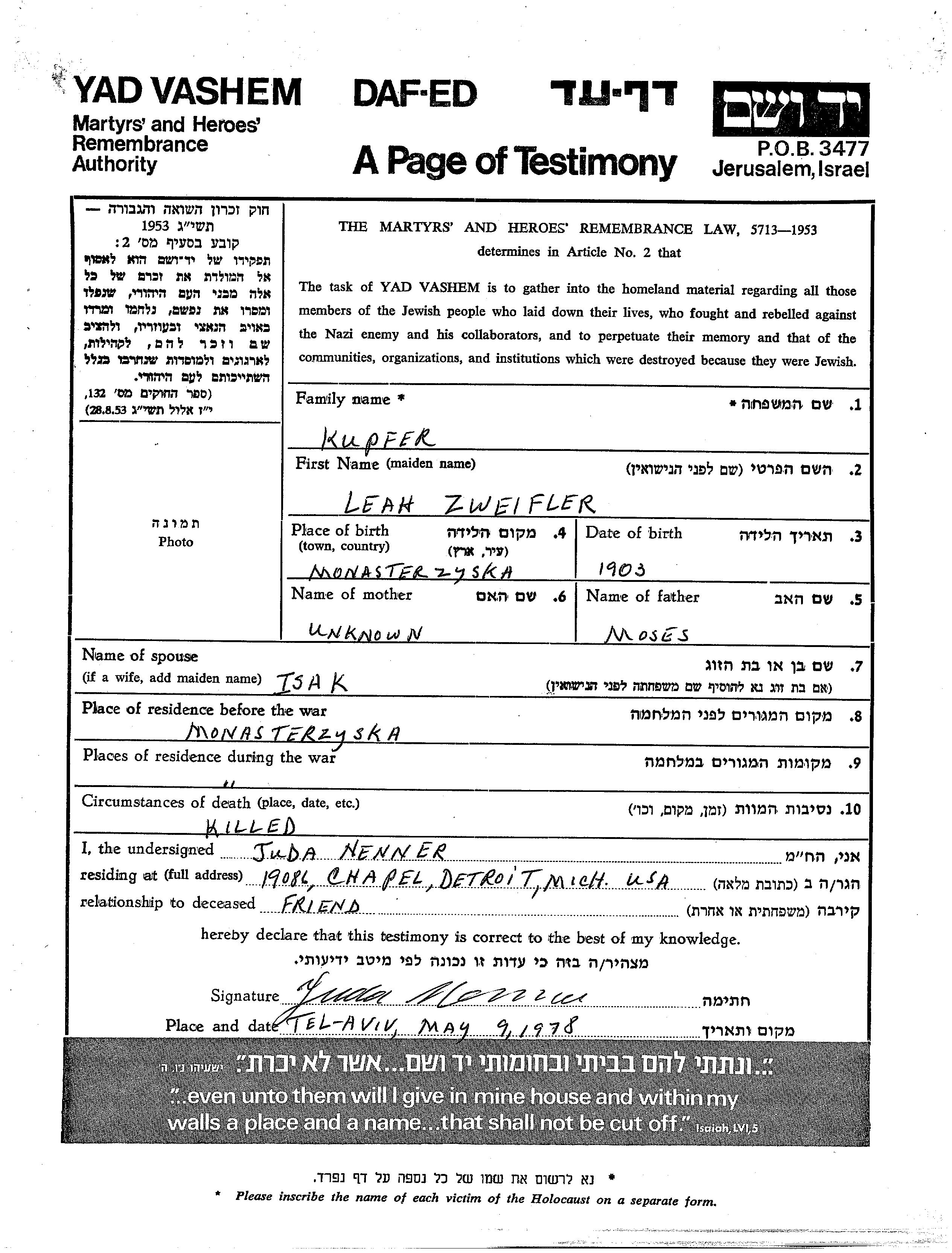 Leah Kupfer, geb. Zweifler wurde im Jahr 1903 in Monasterzyska, Polen geboren. Sie war die Tochter von Moses. Sie war mit Isak Verheiratet. Vor dem Zweiten Weltkrieg lebte sie in Monasterzyska, Polen. Während des Krieges war sie in Monasterzyska, Polen.