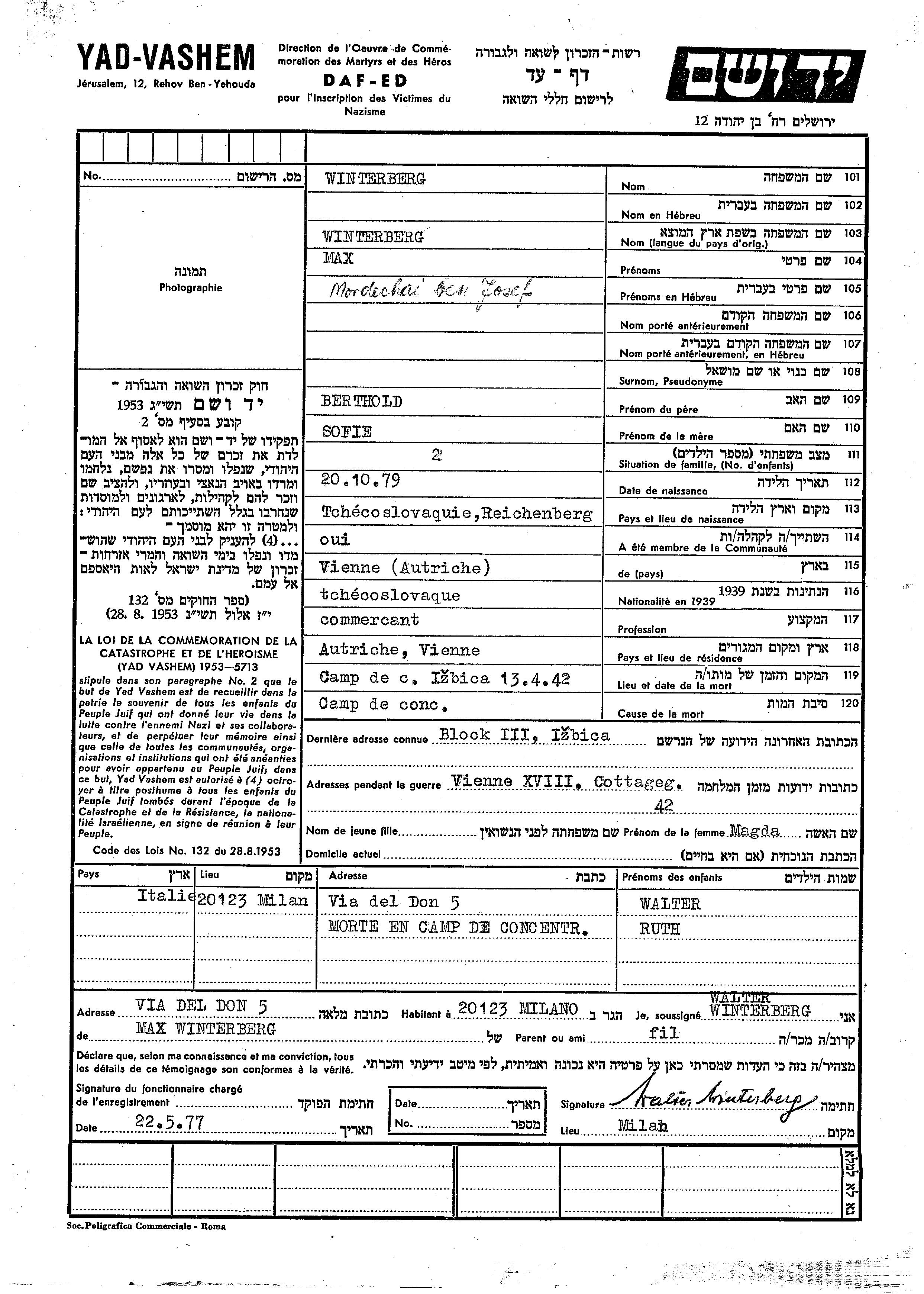 Max Mordechai Winterberg wurde im Jahr 1879 in Reichenberg, Tschechoslowakei geboren. Er war der Sohn von Berthold und Sofie. Er war Kaufmann/-frau und mit Magda Verheiratet. Vor dem Zweiten Weltkrieg lebte er in Vienna, Österreich. Während des Krieges war er in Vienna, Österreich.