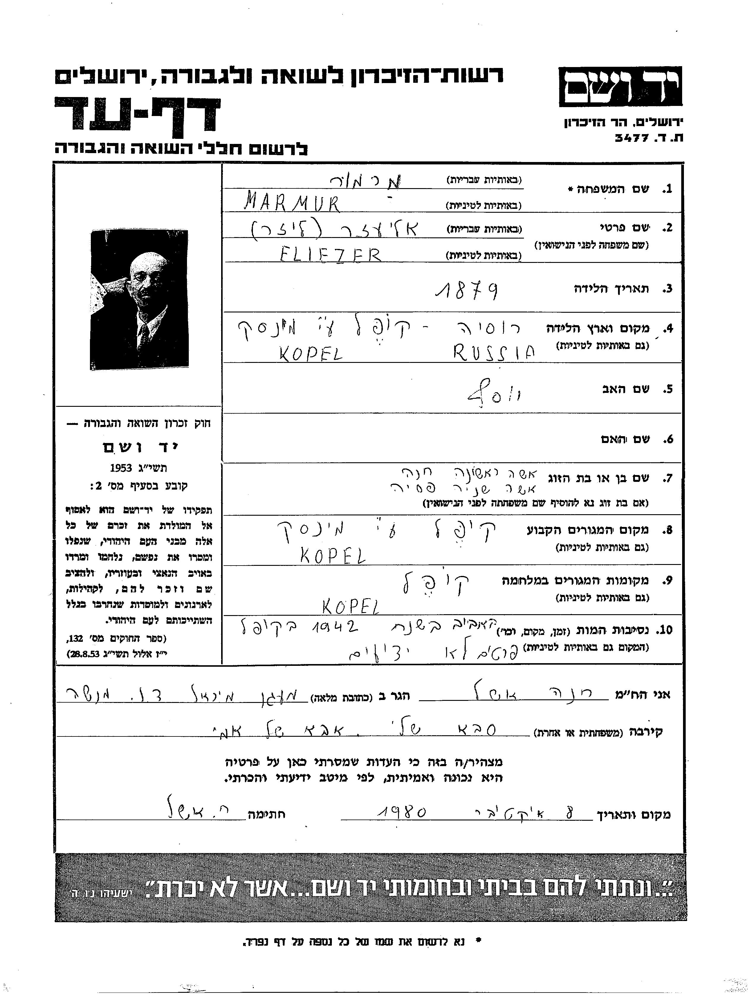 Eliezer Marmur wurde im Jahr 1879 in Kopel, Weißrussland (UdSSR) geboren. Er war der Sohn von Yosef. Er war mit Pesia Verheiratet. Vor dem Zweiten Weltkrieg lebte er in Kopel, Weißrussland (UdSSR). Während des Krieges war er in Kopel, Weißrussland (UdSSR).
