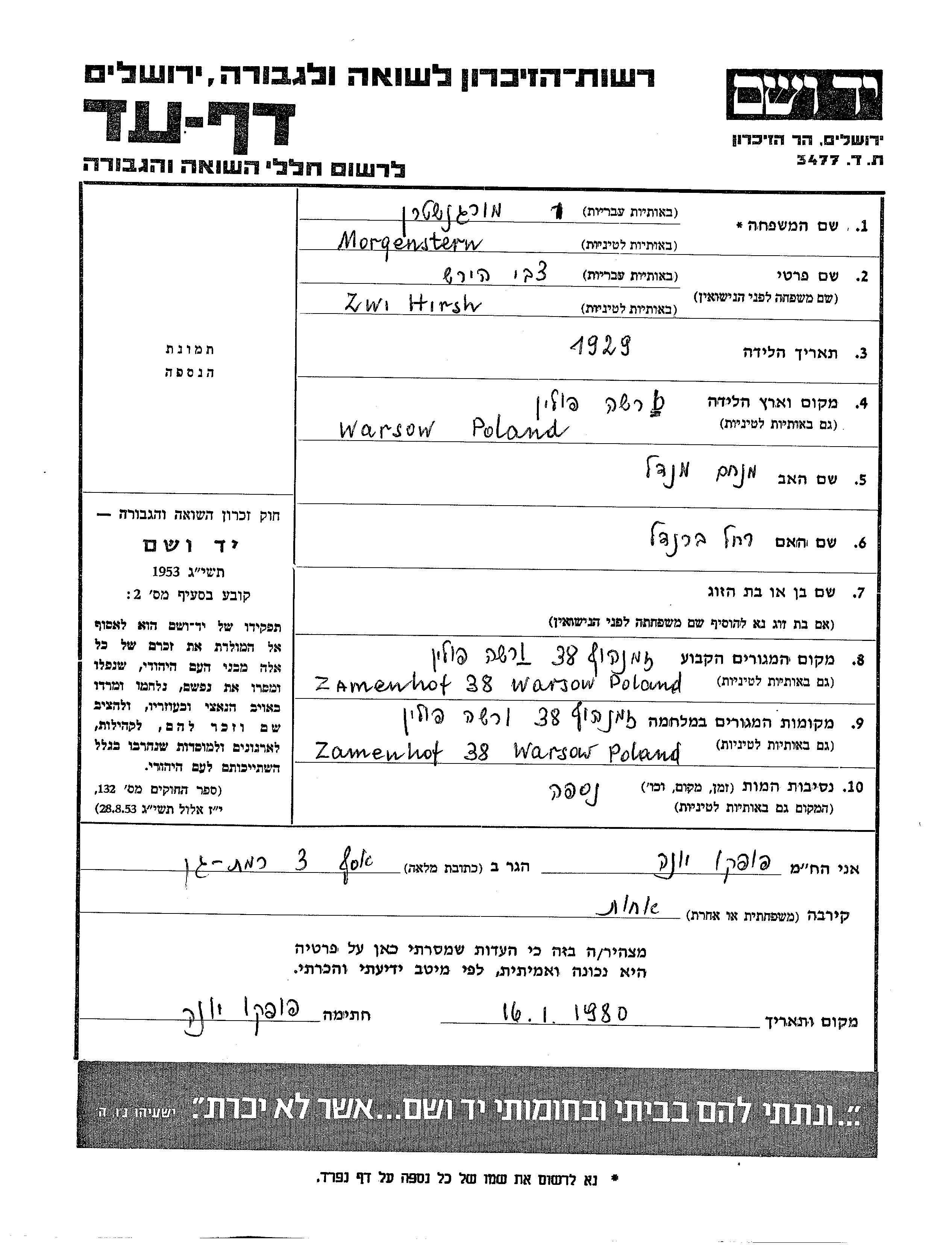 Zwi Hirsh Morgenstern wurde im Jahr 1929 in Warsaw, Polen geboren. Er war der Sohn von Menakhem Mendel und Rakhel Brandel. Vor dem Zweiten Weltkrieg lebte er in Warsaw, Polen. Während des Krieges war er in Warsaw, Polen.