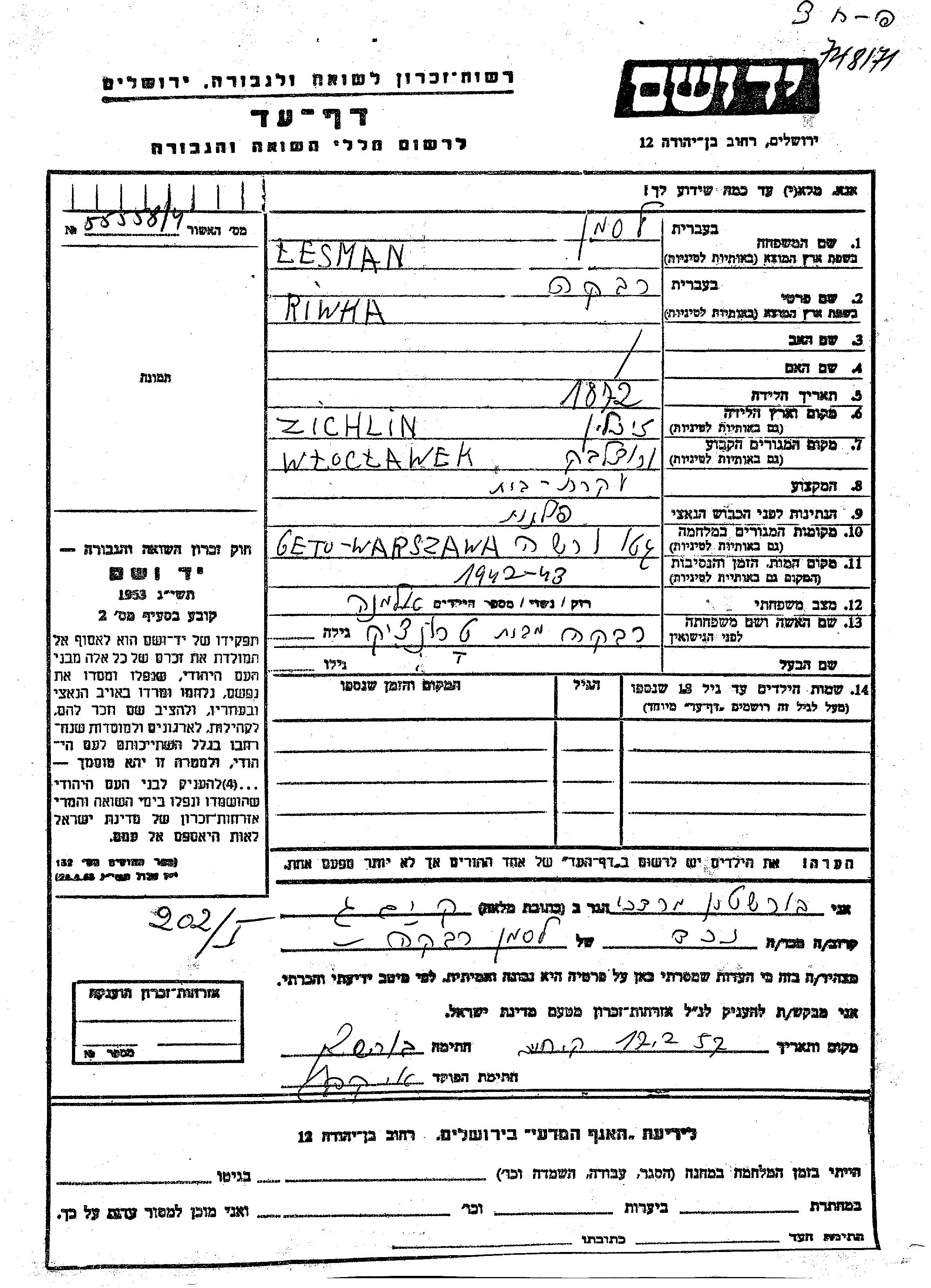 Riwka Lesman, geb. Taronchik wurde im Jahr 1872 in Zichlin, Polen geboren. Sie war Hausfrau und mit Rivka Witwe. Vor dem Zweiten Weltkrieg lebte sie in Wloclawek, Polen. Während des Krieges war sie in Warsaw, Polen.