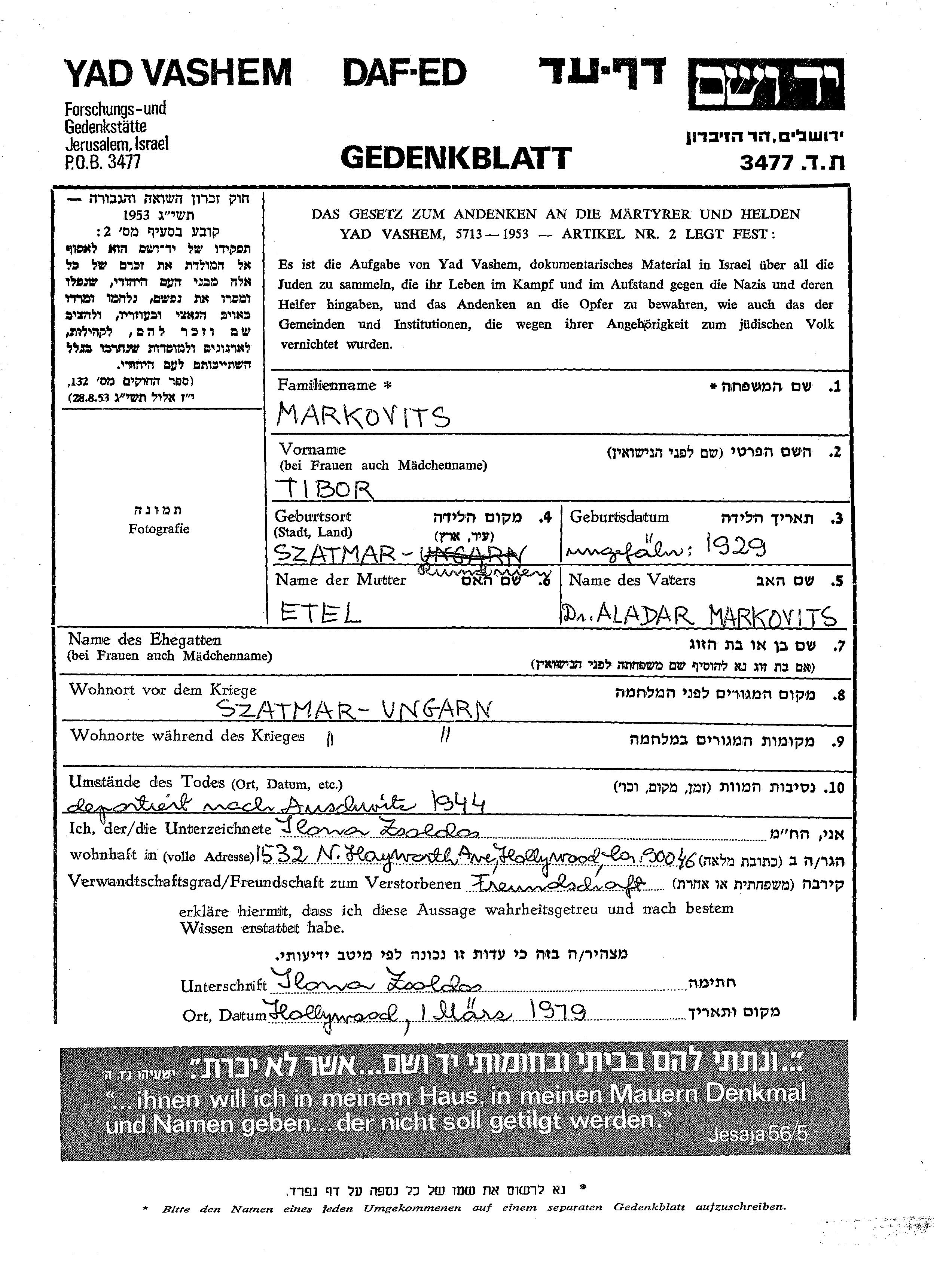 Markovitz Tibor 1929 Szatmarnemeti, Rumänien Gedenkblatt