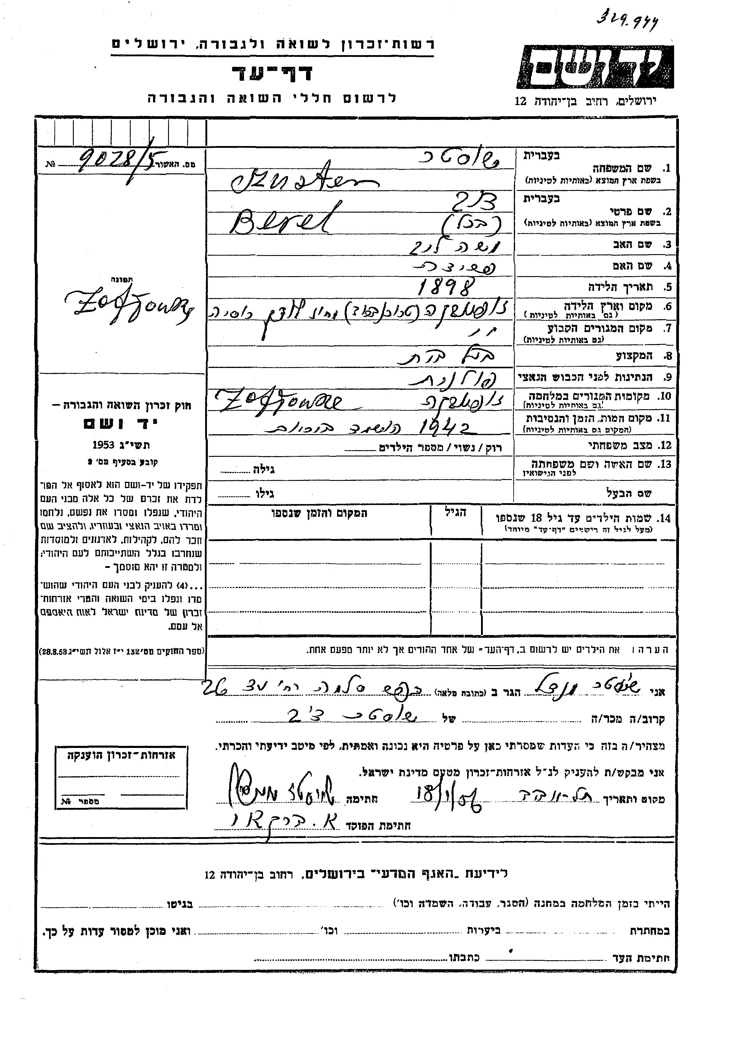 Berl Dov wurde in der Schoah ermordet. Todesort: unbekannt im Jahr 1942.
