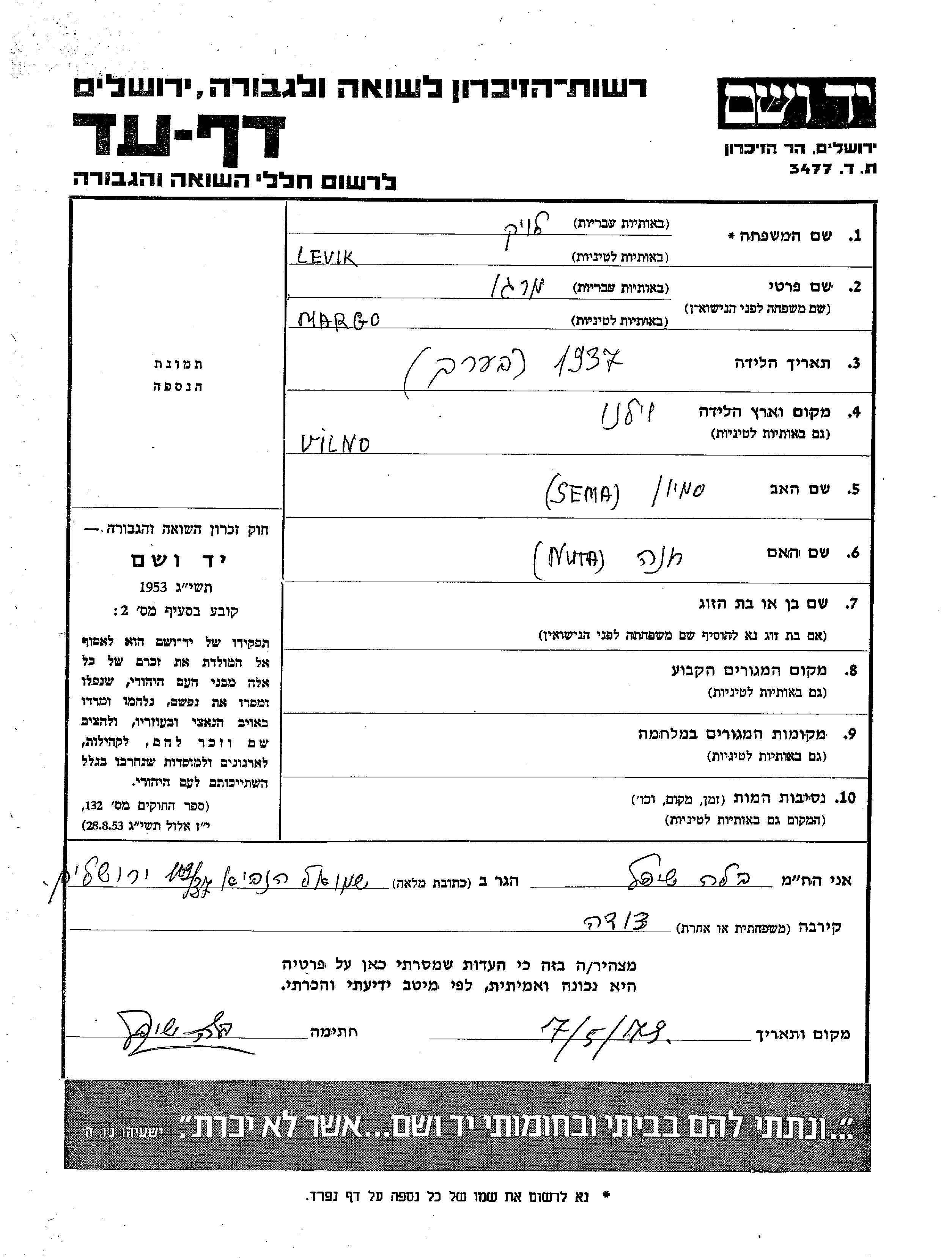 Levik Margo 1937 unbekannter Ort, Gedenkblatt