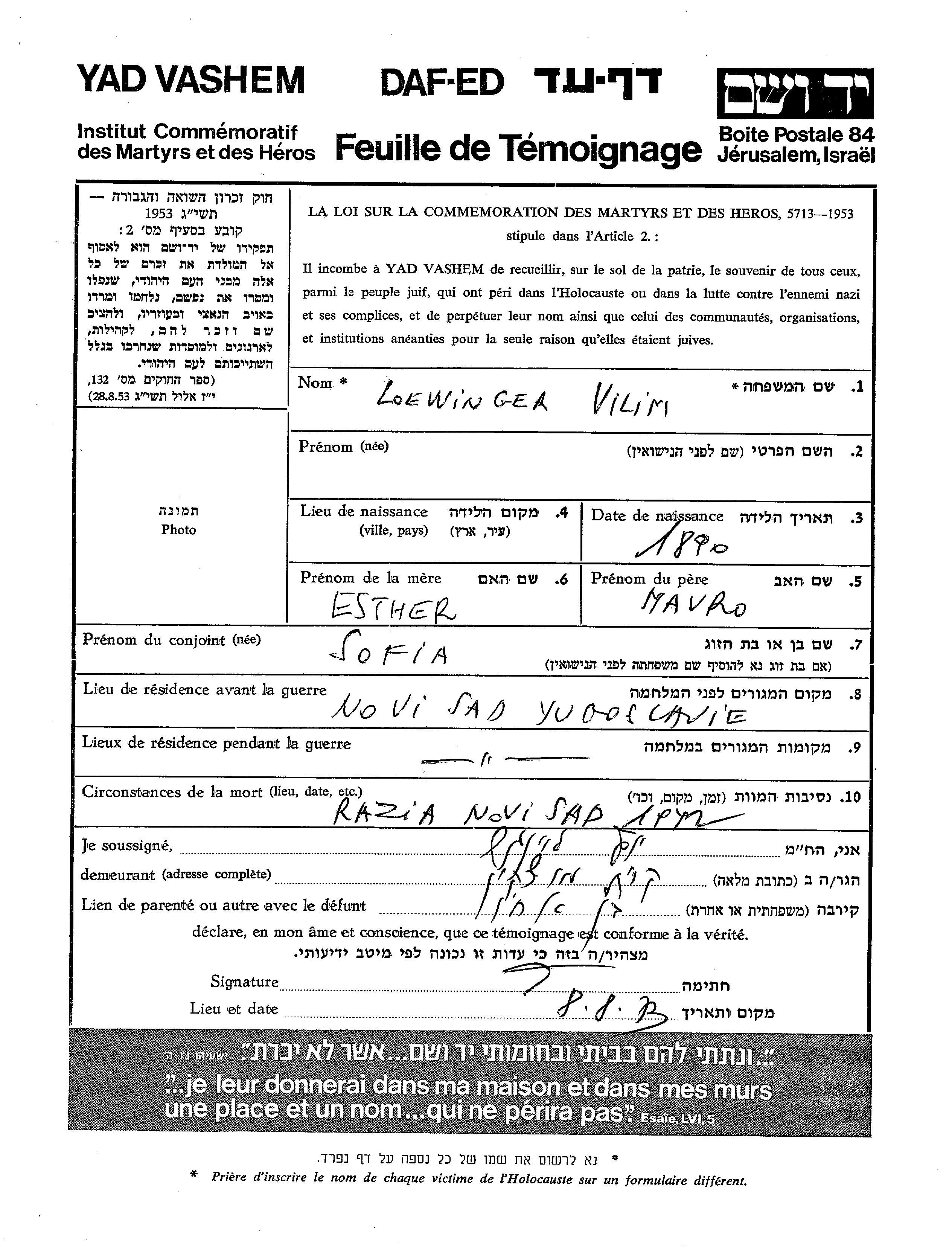Vilim wurde in der Schoah ermordet. Todesort: Novi Sad, Jugoslawien im Jahr 1942.