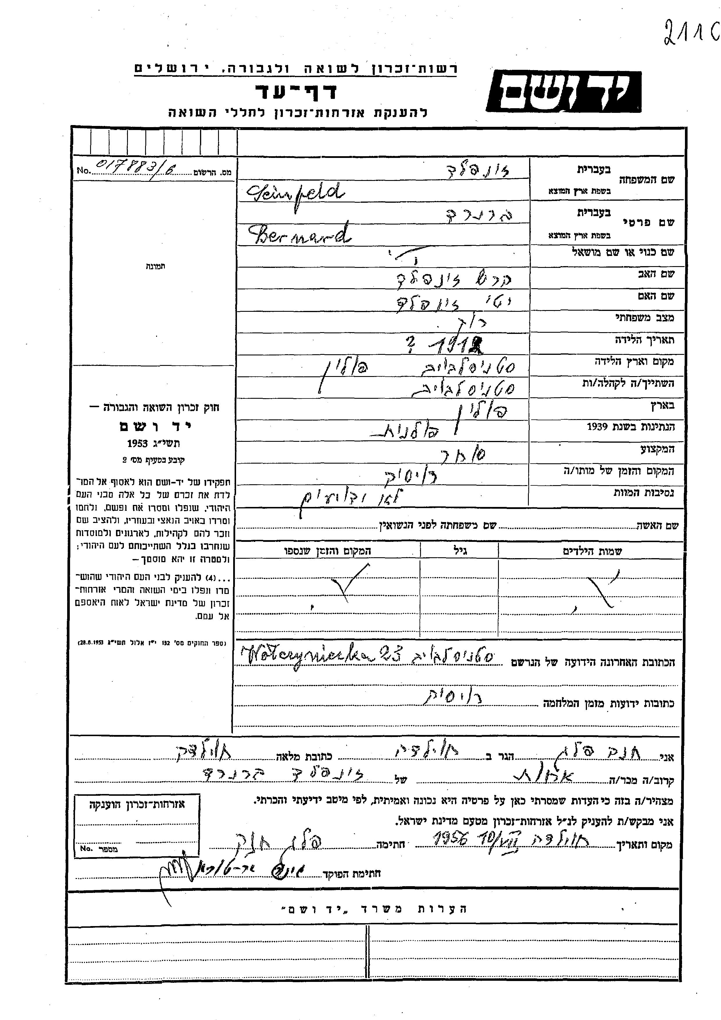 Bernard Sheinfeld wurde im Jahr 1912 in Stanislawow, Polen geboren. Er war der Sohn von Hersh und Yehudit. Er war Kaufmann/-frau und Ledig. Vor dem Zweiten Weltkrieg lebte er in Stanislawow, Polen. Während des Krieges war er in Russland (UdSSR).