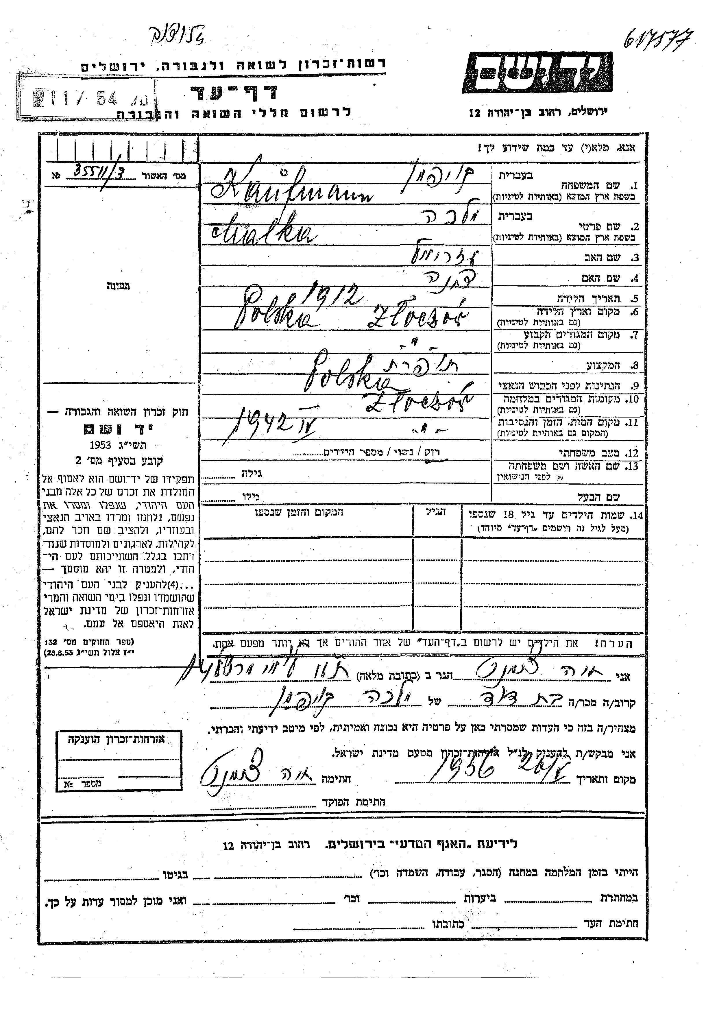 Malka Kaufmann wurde im Jahr 1912 in Zloczow, Poland geboren. Sie war die Tochter von Azriel und Dina. Sie war Schneiderin und Ledig. Vor dem Zweiten Weltkrieg lebte sie in Zloczow, Poland. Während des Krieges war sie in Zloczow, Poland.