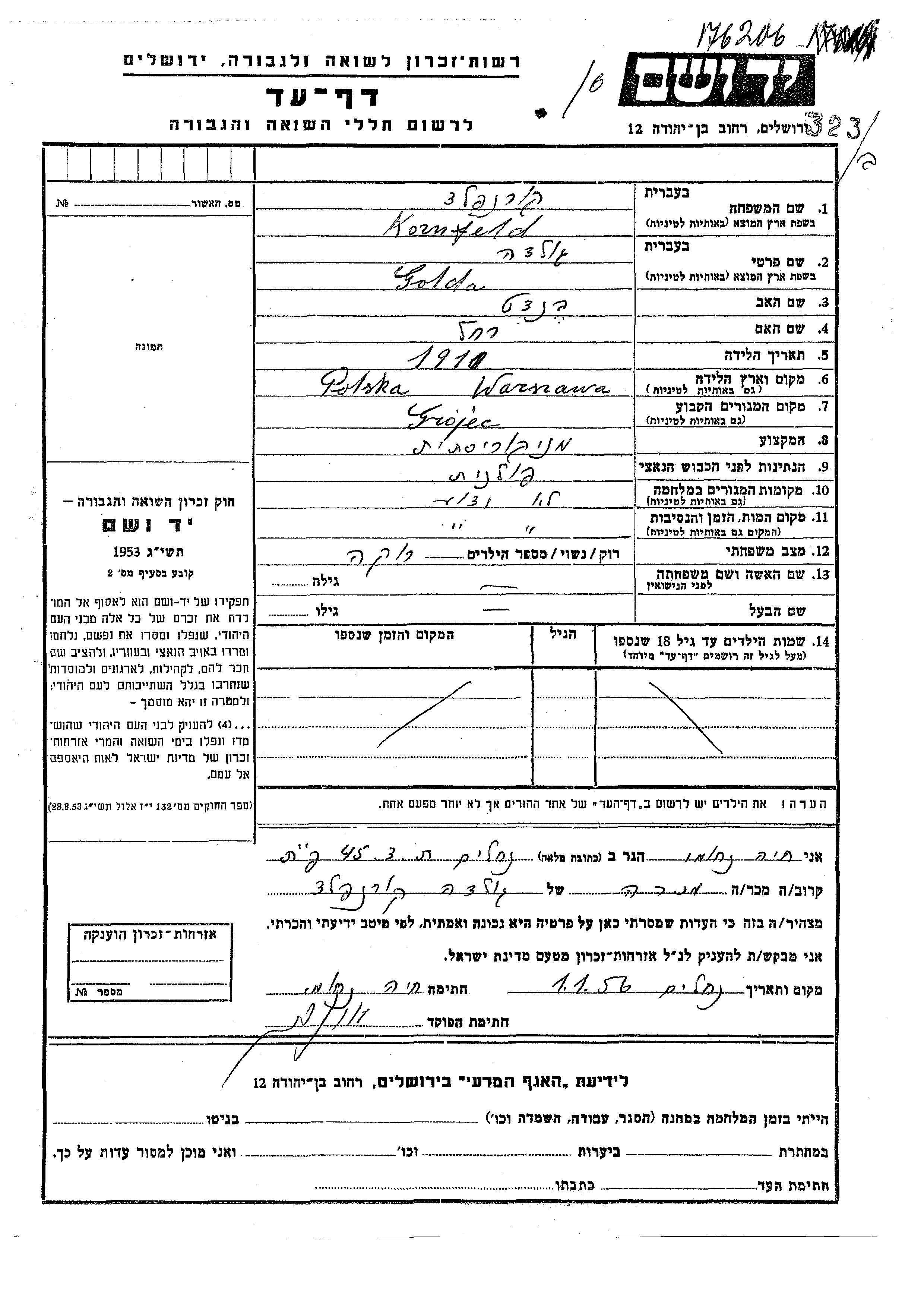 Golda Kornfeld wurde im Jahr 1910 in Warszawa, Polen geboren. Sie war die Tochter von Bendet und Rakhel. Sie war Nagelpflegerin und Ledig. Vor dem Zweiten Weltkrieg lebte sie in Grojec, Polen.