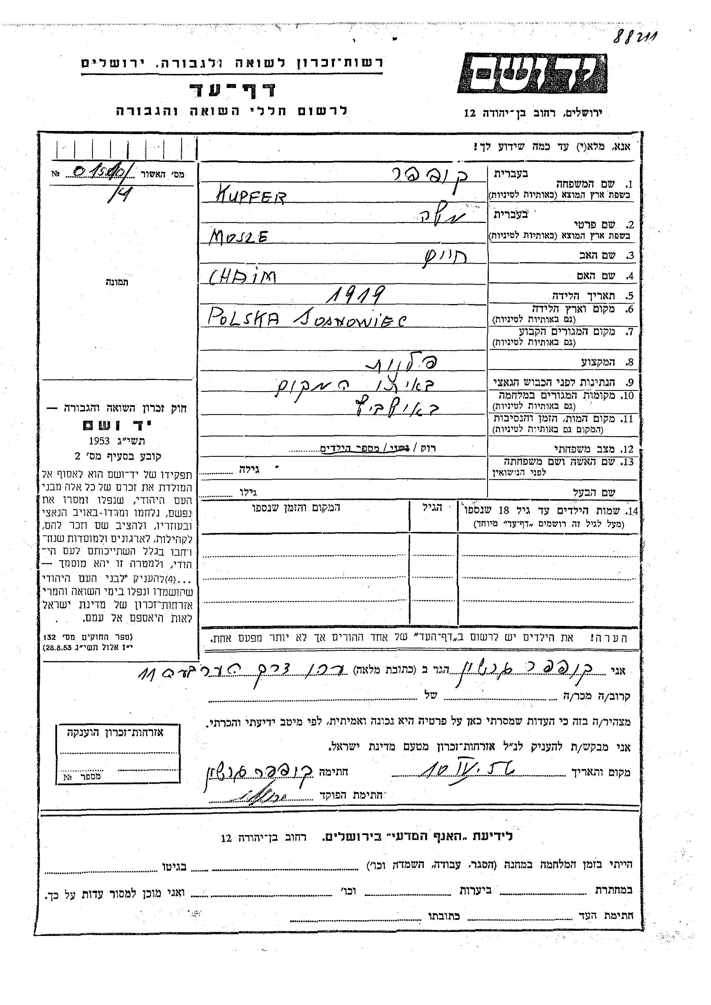 Mosze Kupfer wurde im Jahr 1919 in Sosnowiec, Polen geboren. Er war der Sohn von Chaim. Er war Ledig. Während des Krieges war er in Auschwitz, Polen.
