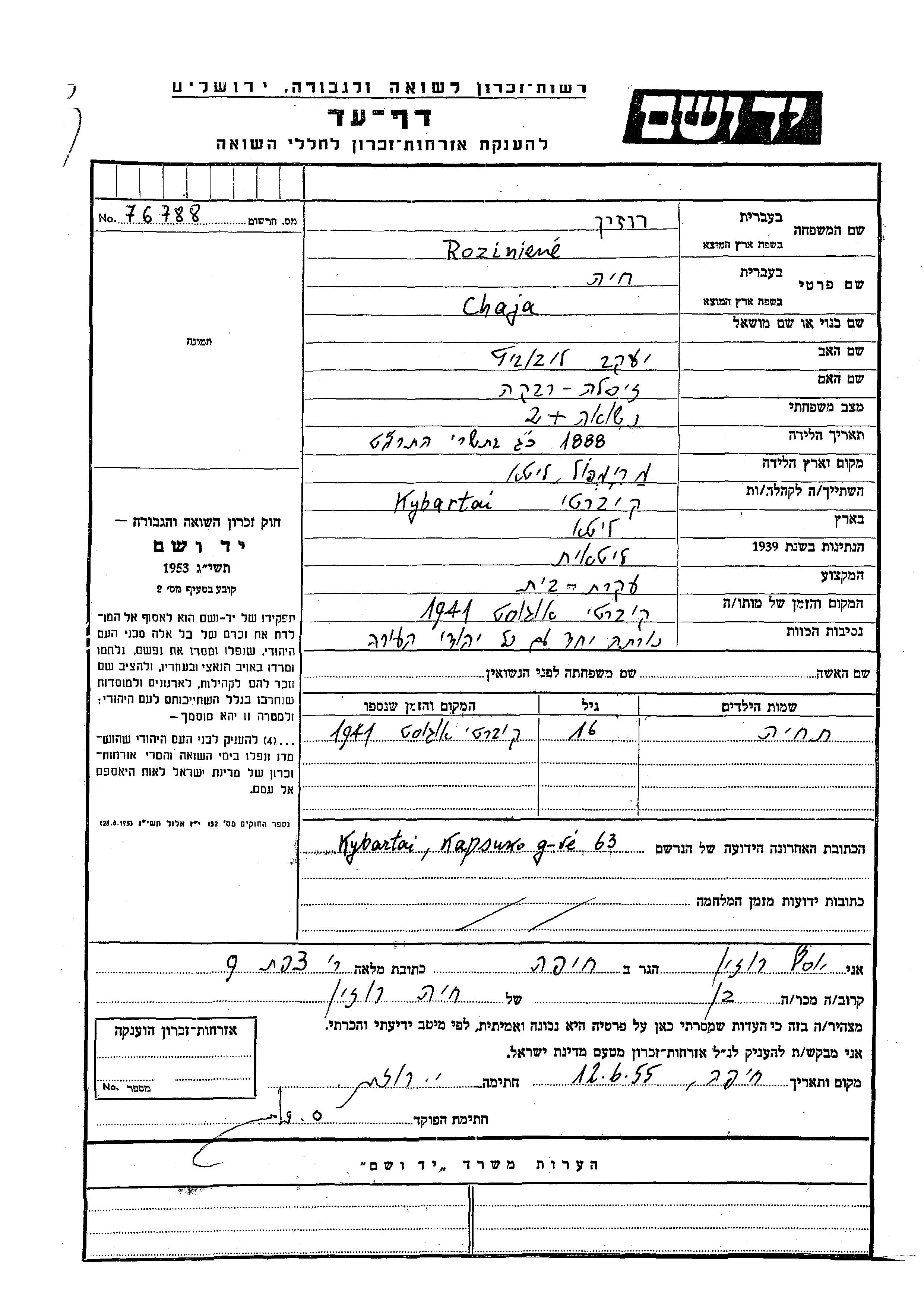 Chaja Roziniene, geb. Libovitz wurde im Jahr 1888 in Mariampol, Litauen geboren. Sie war die Tochter von Yaakov und Zisla Rivka. Sie war Hausfrau und Verheiratet. Vor dem Zweiten Weltkrieg lebte sie in Kybartai, Litauen. Während des Krieges war sie in Kybartai, Litauen.