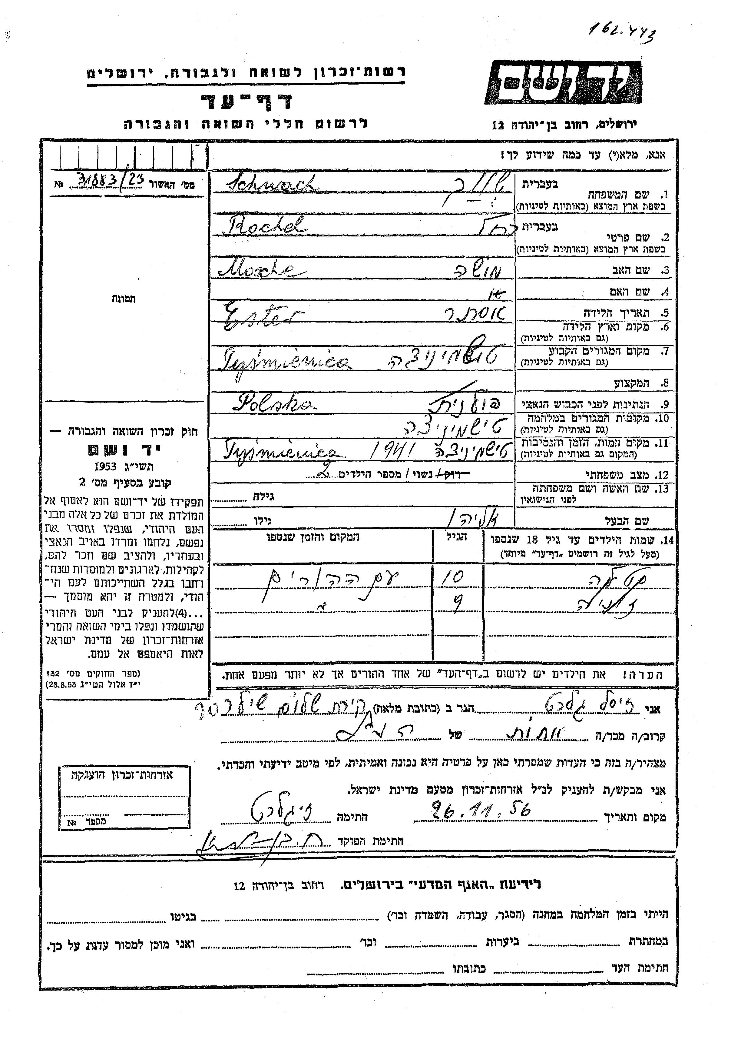 Rochel Schwach Shevak wurde in Ilyintsy, Ukraine (UdSSR) geboren. Sie war die Tochter von Mosche und Ester. Sie war mit Eliahu Verheiratet. Vor dem Zweiten Weltkrieg lebte sie in Tysmienica, Polen. Während des Krieges war sie in Tysmienica, Polen.