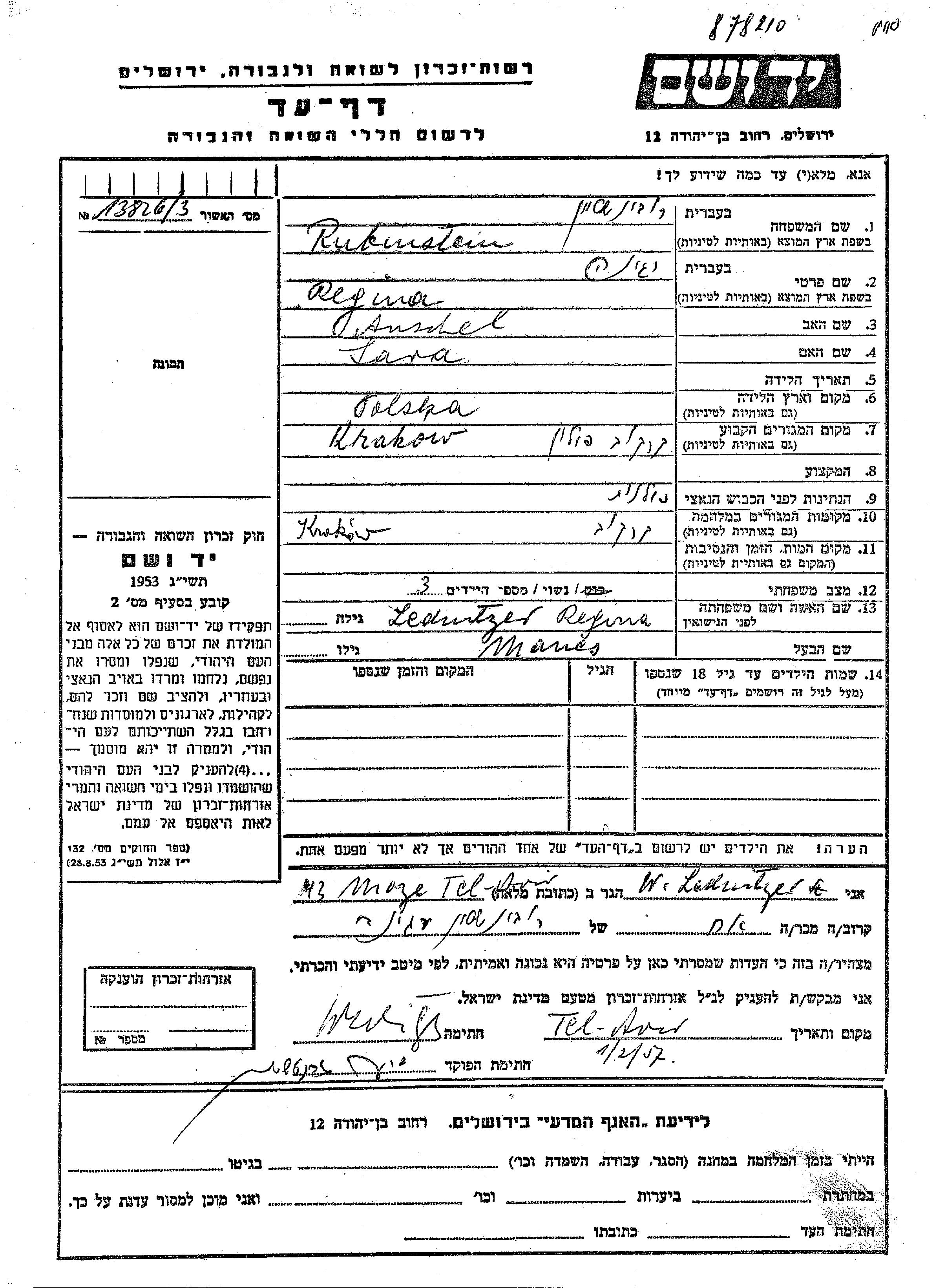 Regina Rubinstein, geb. Lednitzer wurde in Polen geboren. Sie war die Tochter von Smuel und Sara. Sie war mit Manes Verheiratet. Vor dem Zweiten Weltkrieg lebte sie in Krakow, Polen. Während des Krieges war sie in Krakow, Polen.