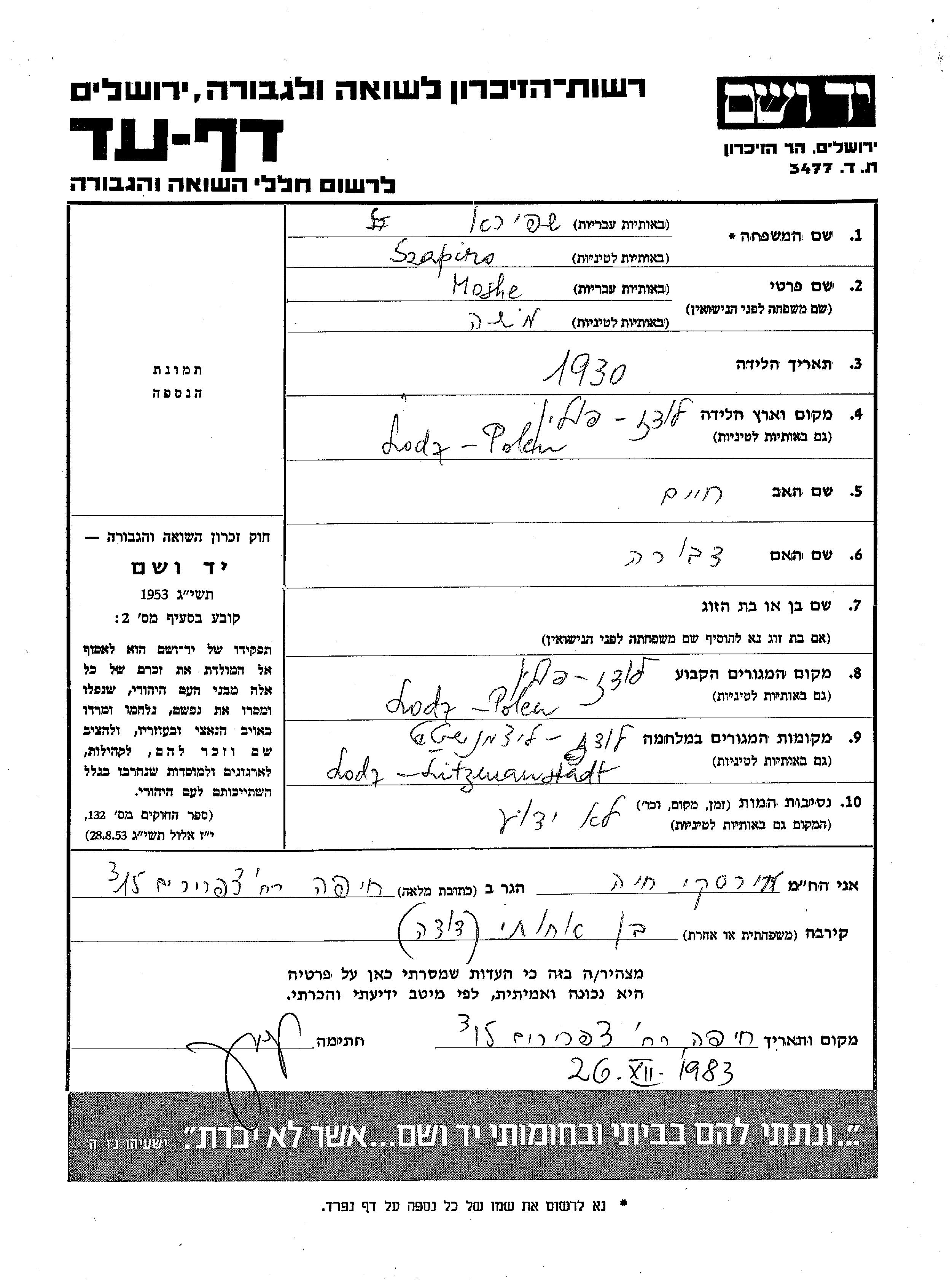 Moshe Szapiro wurde im Jahr 1930 in Lodz, Polen geboren. Er war der Sohn von Khaim und Dvora. Vor dem Zweiten Weltkrieg lebte er in Lodz, Polen. Während des Krieges war er in Litzmannstadt, Polen.