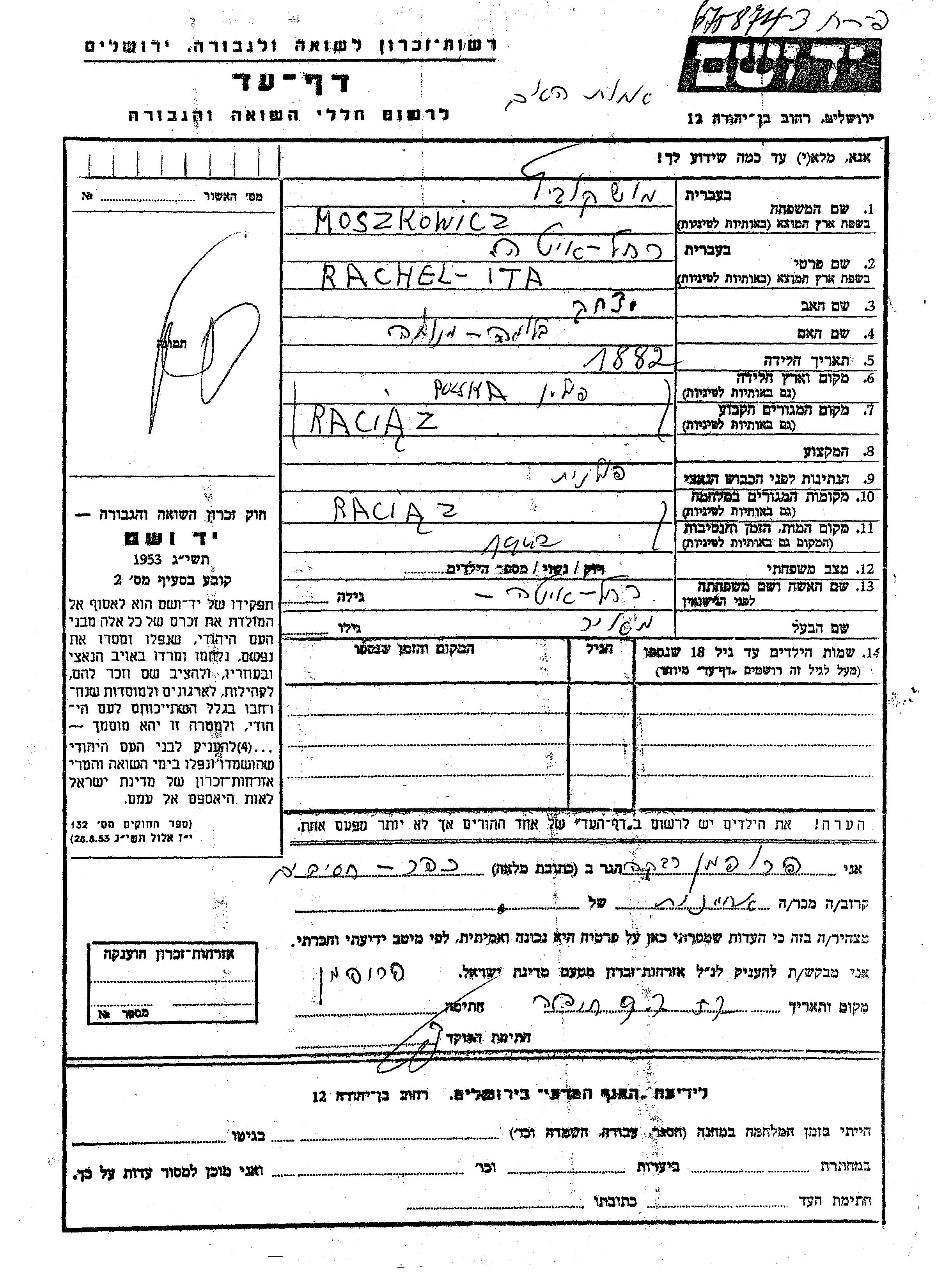 Rachel Ita Moszkowicz wurde im Jahr 1882 in Raciaz, Polen geboren. Sie war die Tochter von Yitzkhak und Bluma Menukha. Sie war mit Meir Verheiratet. Vor dem Zweiten Weltkrieg lebte sie in Raciaz, Polen. Während des Krieges war sie in Raciaz, Polen.