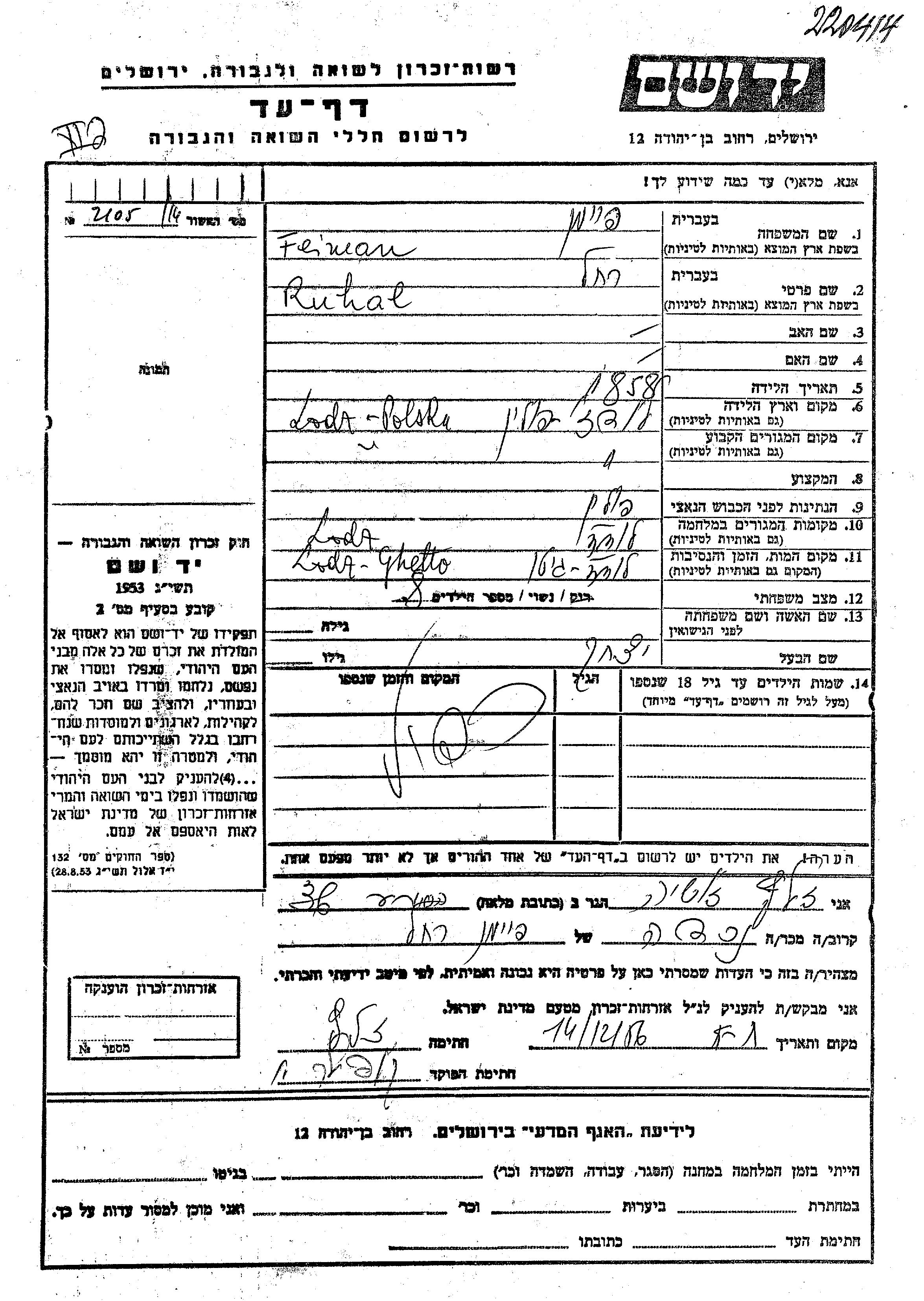 Ruhal Feiman wurde im Jahr 1858 in Lodz, Polen geboren. Sie war mit Yitzkhak Verheiratet. Vor dem Zweiten Weltkrieg lebte sie in Lodz, Polen. Während des Krieges war sie in Lodz, Polen.