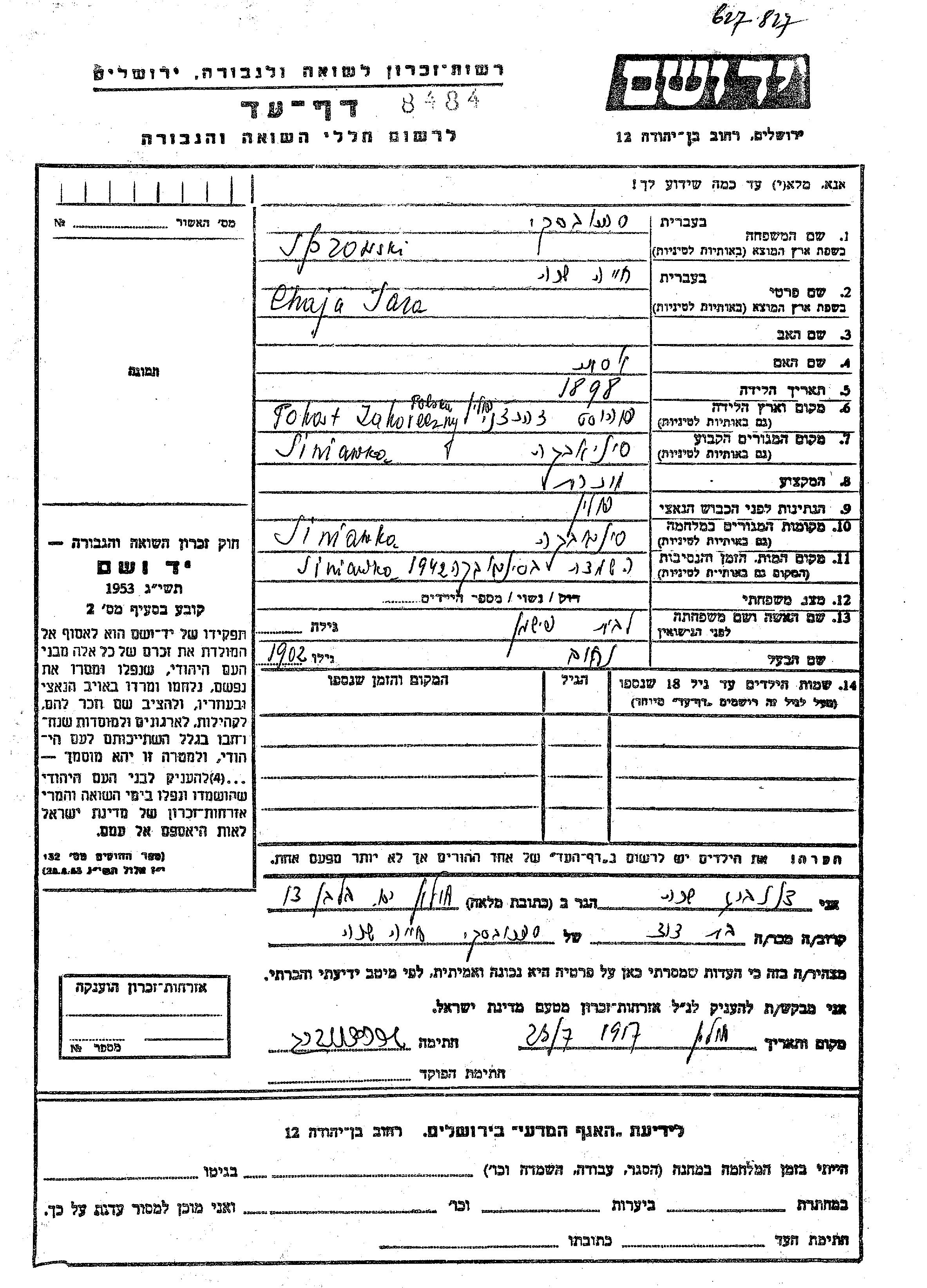 Chaja Sara Sprowski Sprovski, geb. Fishman wurde im Jahr 1898 in Pohost Zarzeczny, Polen geboren. Sie war die Tochter von Ester. Sie war Handelsvertreterin und mit Nakhum Verheiratet. Vor dem Zweiten Weltkrieg lebte sie in Siniawka, Polen. Während des Krieges war sie in Siniawka, Polen.