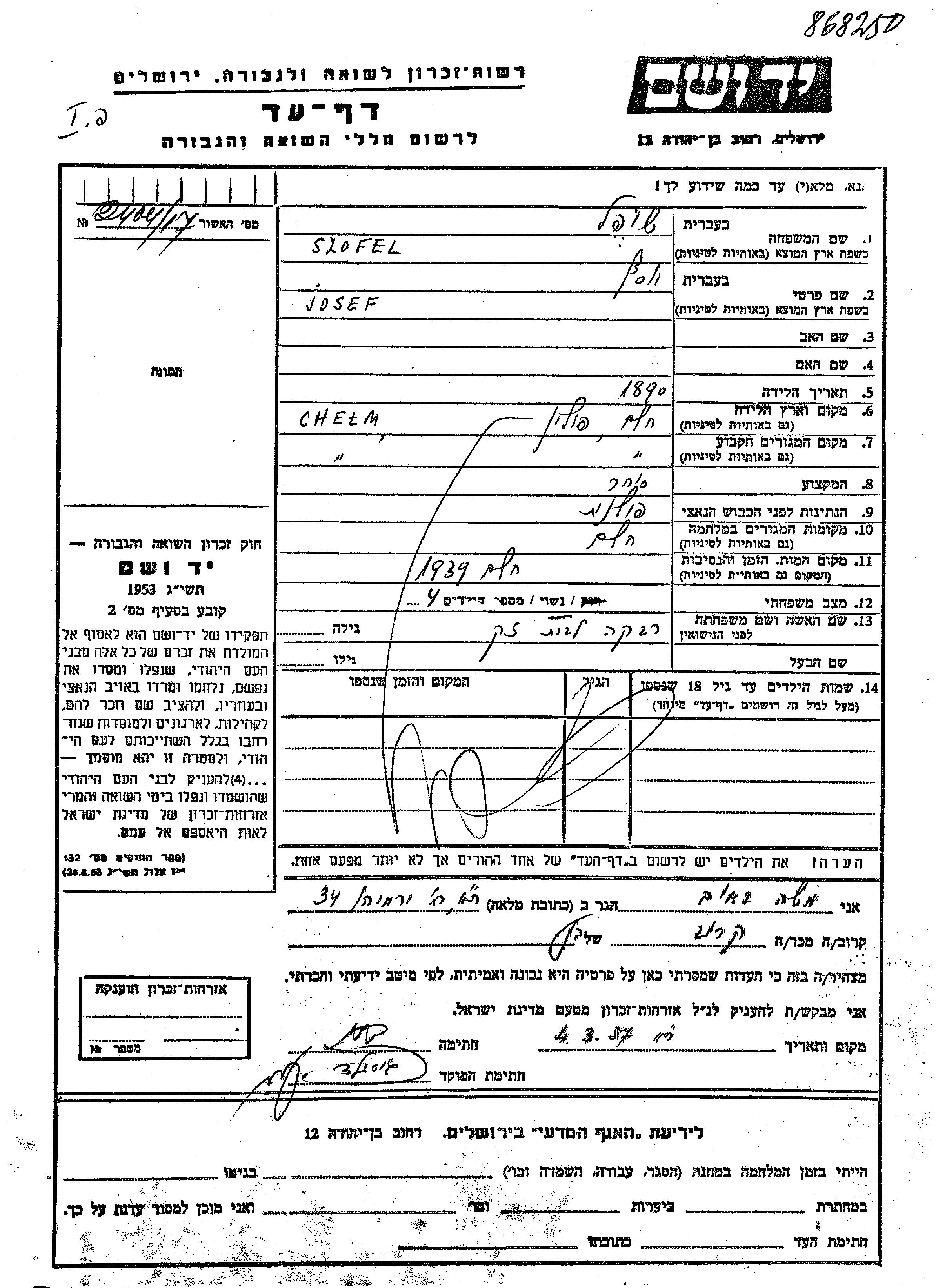 Josef Szofel wurde im Jahr 1890 in Chelm, Polen geboren. Er war Kaufmann/-frau und mit Rivka, geb. Zak Verheiratet. Vor dem Zweiten Weltkrieg lebte er in Chelm, Polen. Während des Krieges war er in Chelm, Polen.