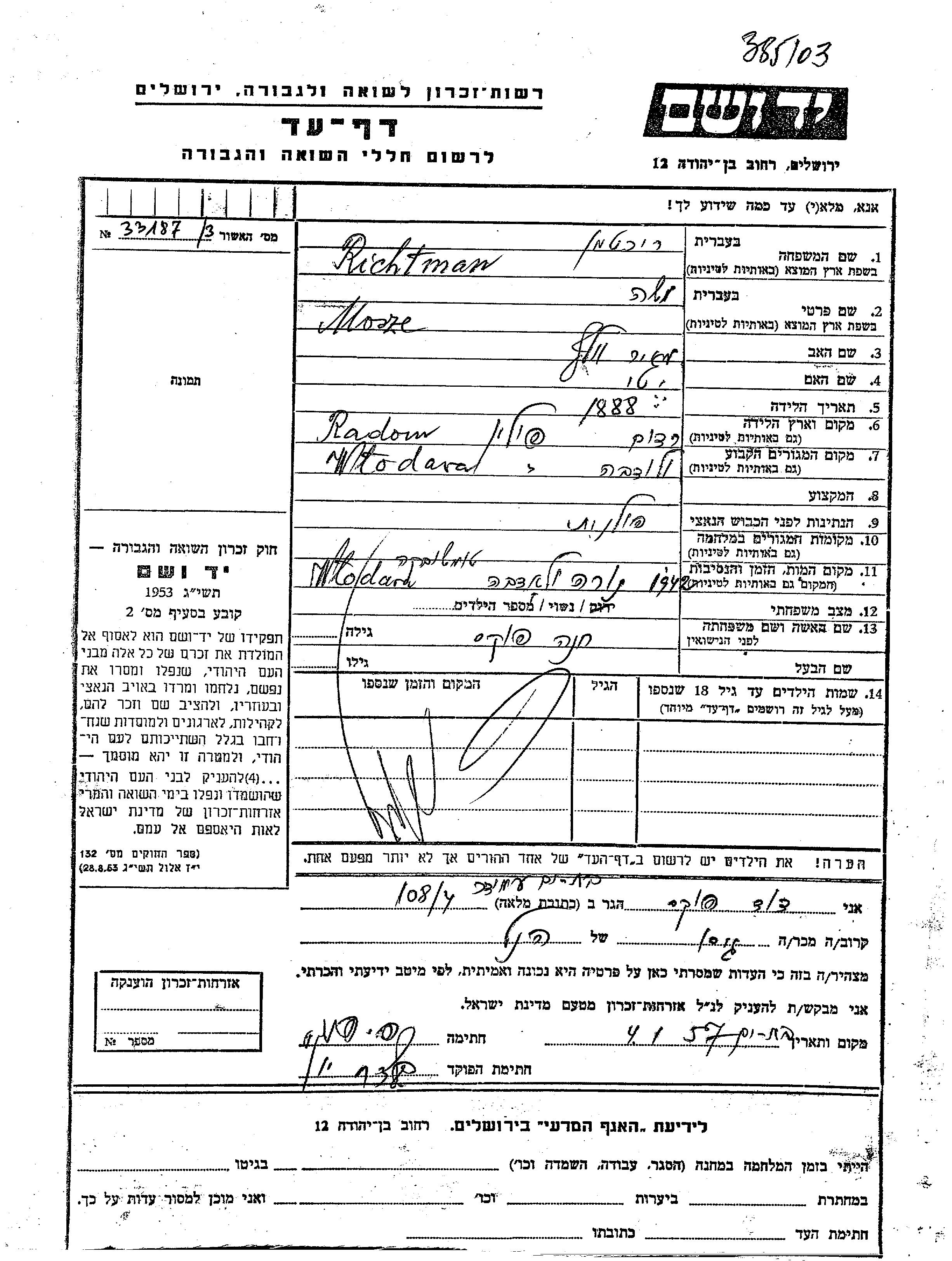 Mosze Richtman wurde im Jahr 1888 in Radom, Polen geboren. Er war der Sohn von Meir Volf und Yehudit. Er war mit Khana, geb. Fuks Verheiratet. Vor dem Zweiten Weltkrieg lebte er in Wlodawa, Polen.