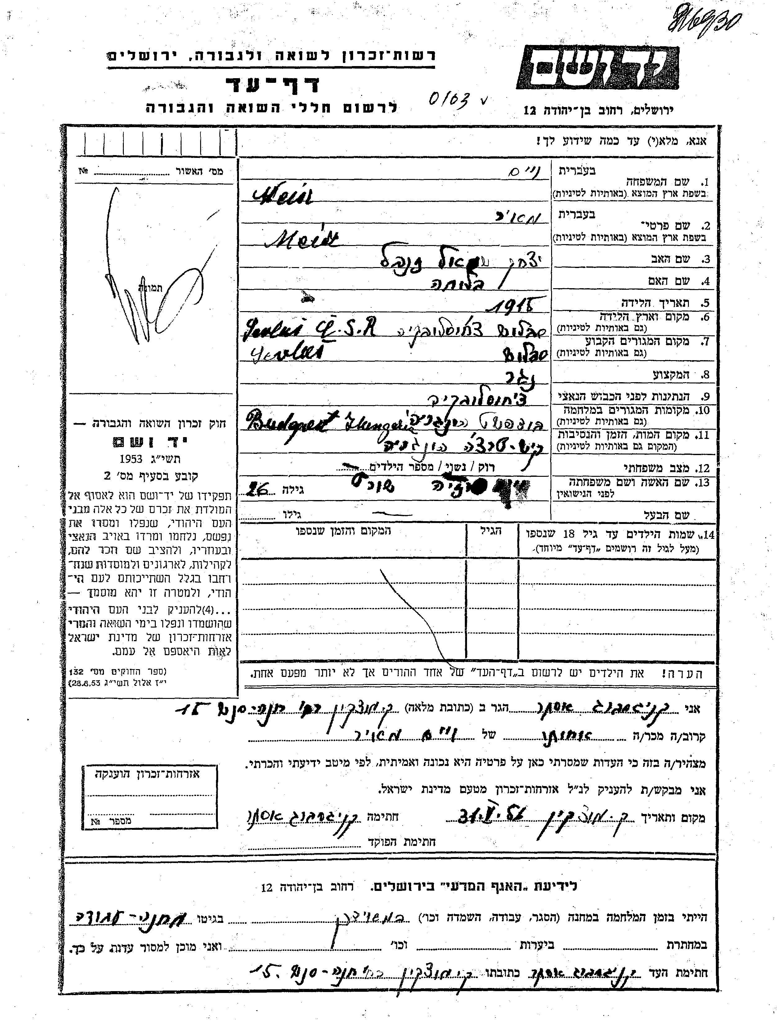 Meir Weis wurde im Jahr 1915 in Sevlus, Tschechoslowakei geboren. Er war der Sohn von Yitzkhak und Shmuel. Er war Zimmermann und mit Roza, geb. Shvartz Verheiratet. Vor dem Zweiten Weltkrieg lebte er in Sevlus, Tschechoslowakei. Während des Krieges war er in Budapest, Ungarn.