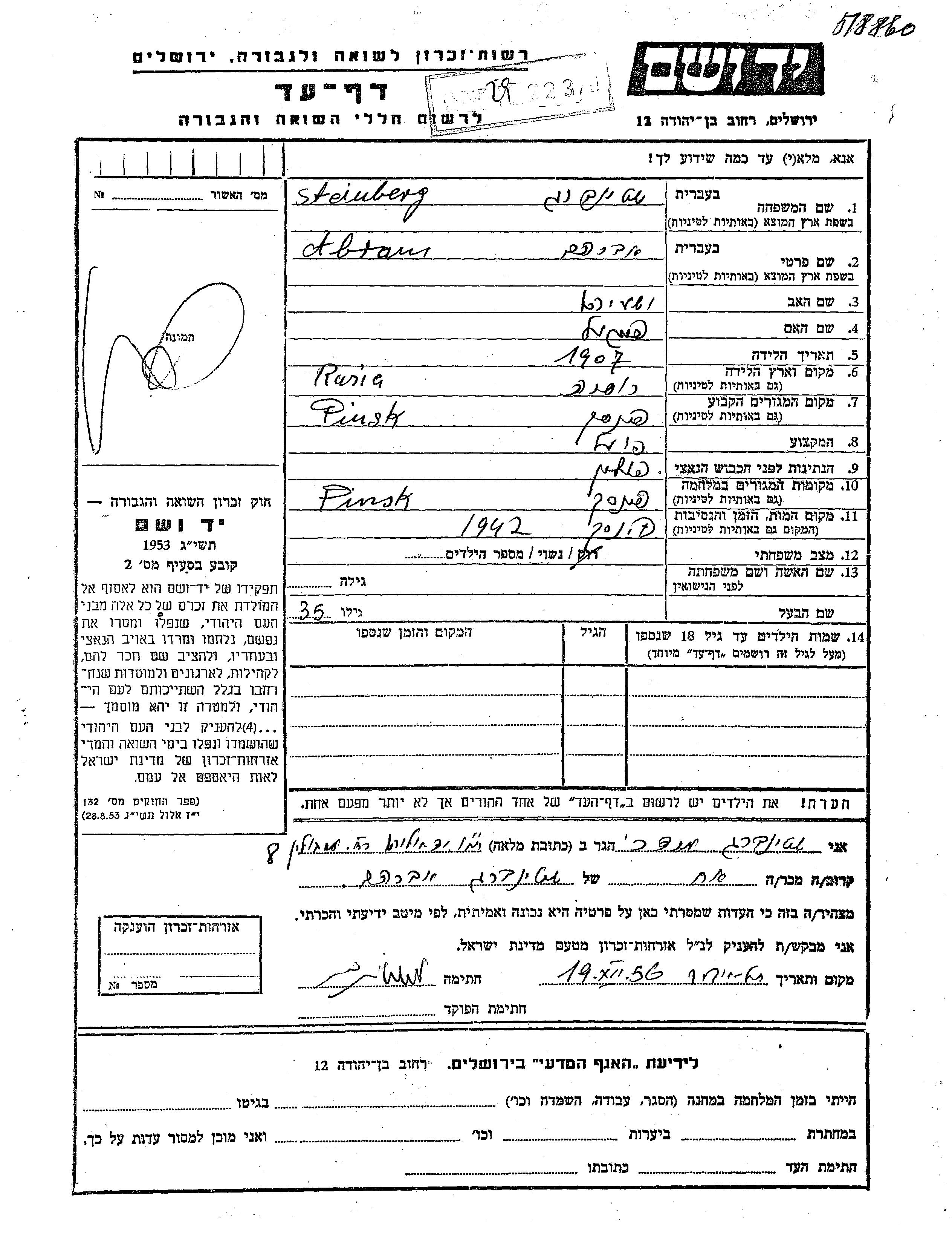 Abram Steinberg wurde im Jahr 1907 in Russland (UdSSR) geboren. Er war der Sohn von Yeshayahu und Feigil. Er war Arbeiter/-in und Verheiratet. Vor dem Zweiten Weltkrieg lebte er in Pinsk, Polen. Während des Krieges war er in Pinsk, Polen.