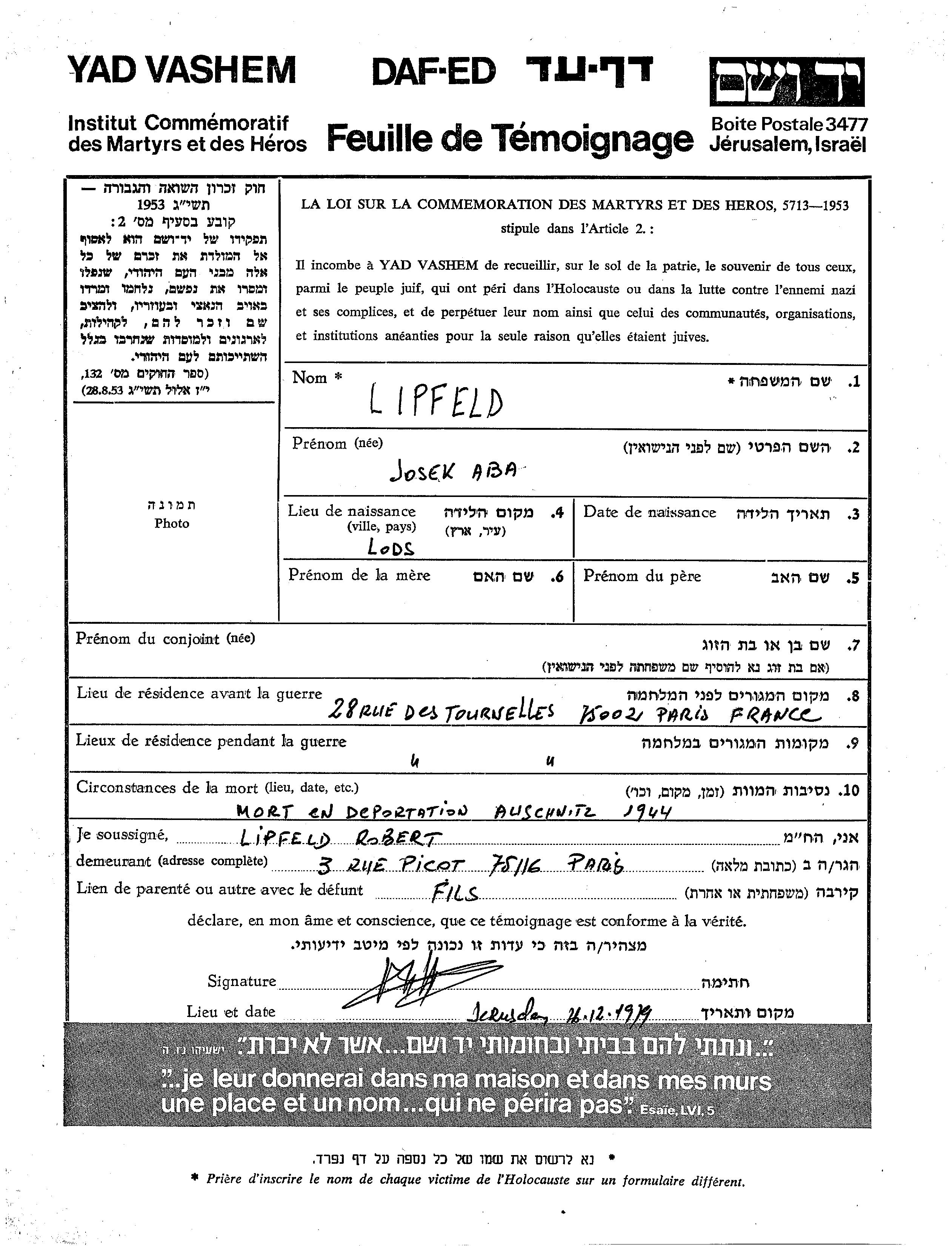 Josek Aba Lipfeld wurde in Lodz, Polen geboren. Vor dem Zweiten Weltkrieg lebte er in Paris, Frankreich. Während des Krieges war er in Paris, Frankreich.