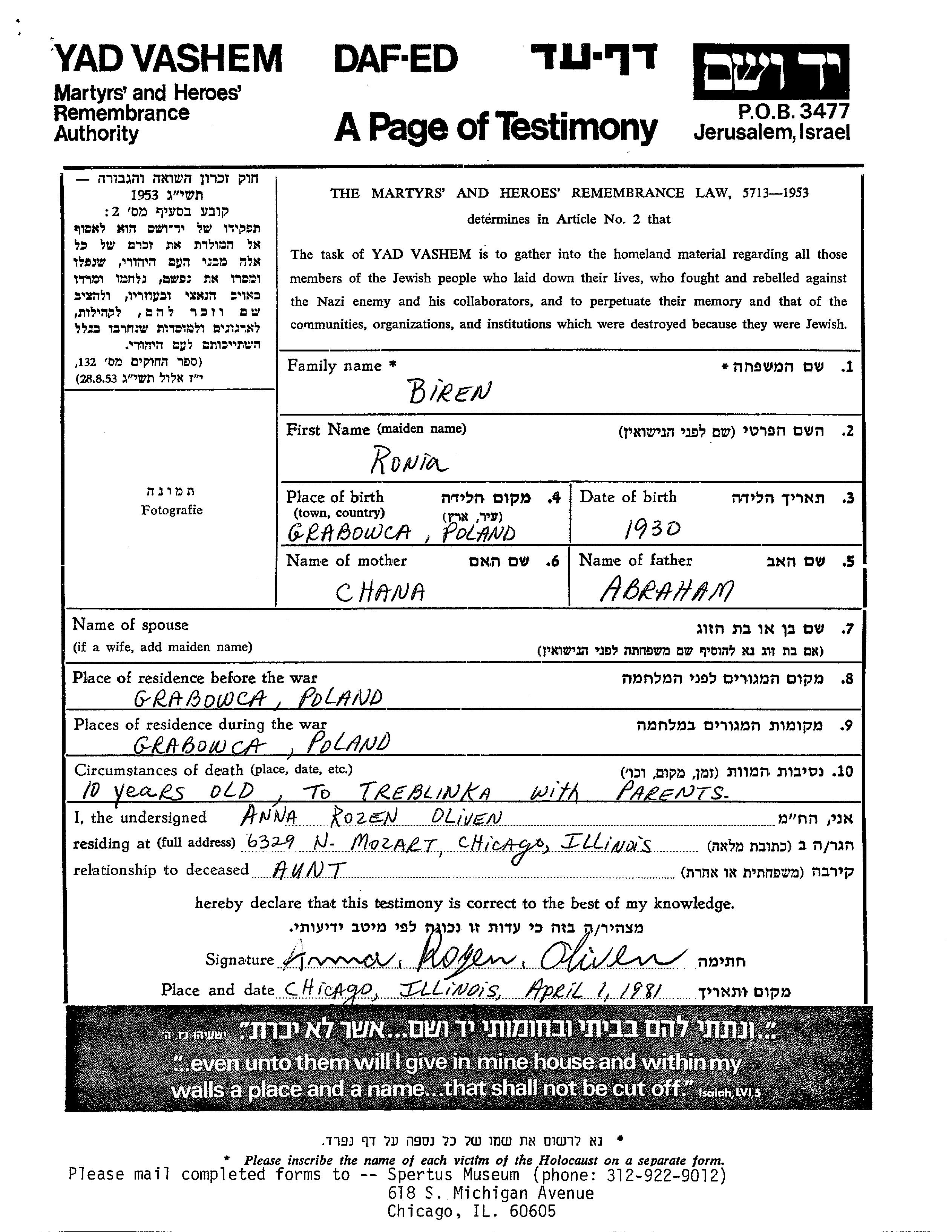 Ronia Biren wurde im Jahr 1930 in Grabowka, Polen geboren. Sie war die Tochter von Abraham und Chana. Vor dem Zweiten Weltkrieg lebte sie in Grabowka, Polen. Während des Krieges war sie in Grabowka, Polen.