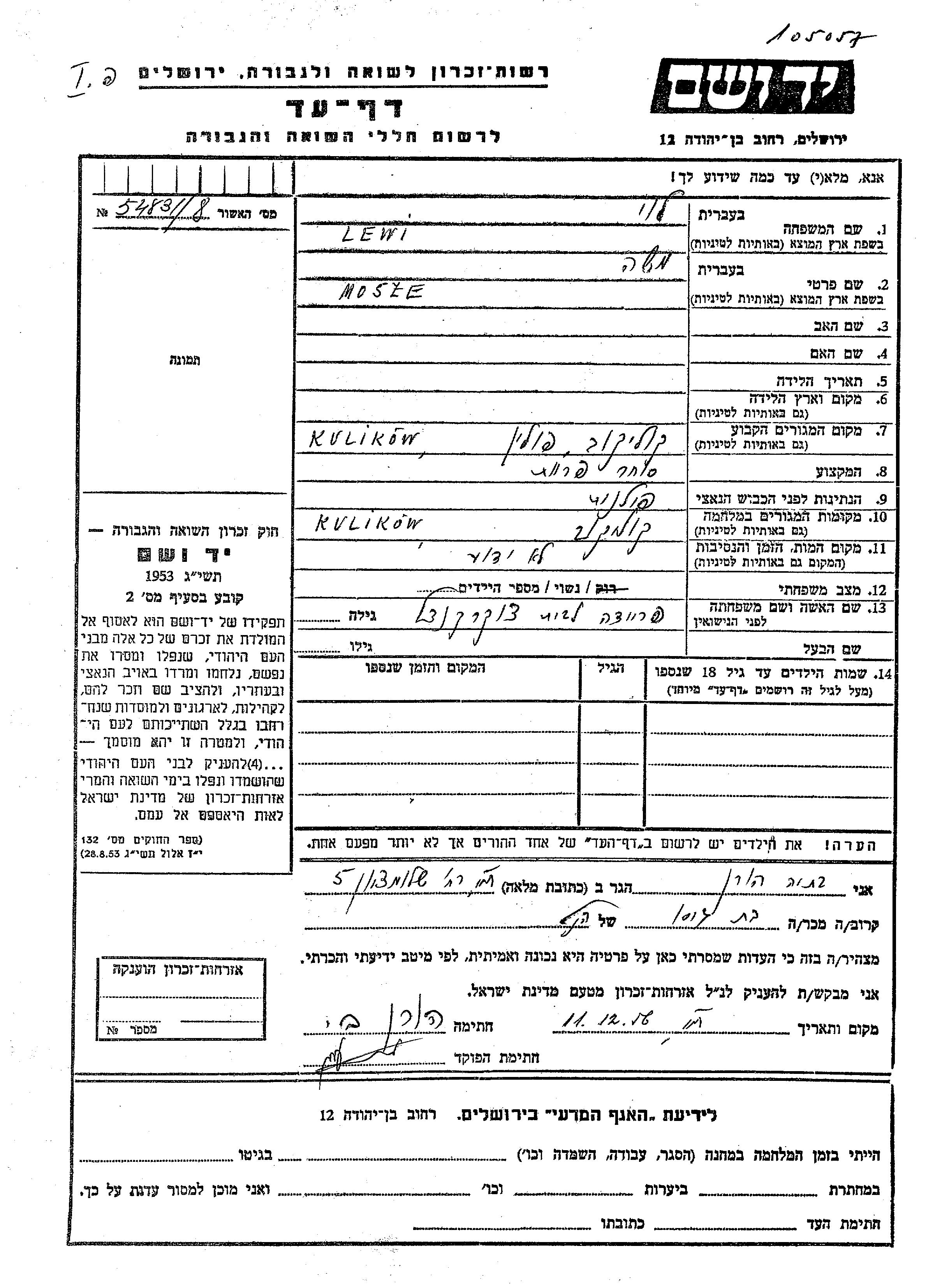 Mosze Lewi wurde in Kulikow, Polen geboren. Er war Pelzhändler und mit Freida, geb. Tzukerkandel Verheiratet. Vor dem Zweiten Weltkrieg lebte er in Kulikow, Polen. Während des Krieges war er in Kulikow, Polen.