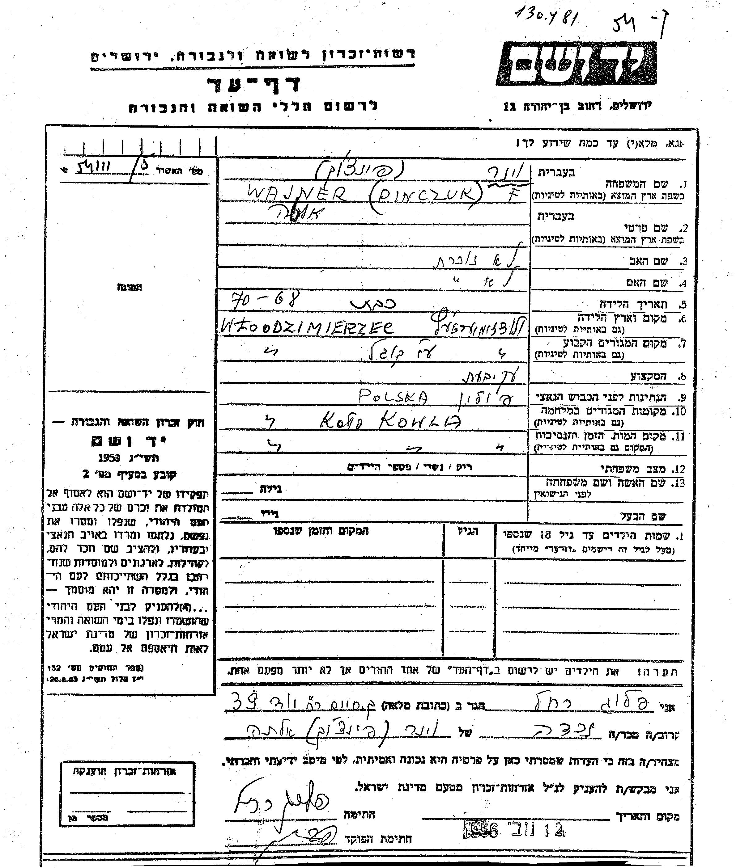 Alte Wajner Pinczuk Viner wurde in Wlodzimierzec, Polen geboren. Sie war Hausfrau. Vor dem Zweiten Weltkrieg lebte sie in Wlodzimierzec, Polen. Während des Krieges war sie in Wlodzimierzec, Polen.